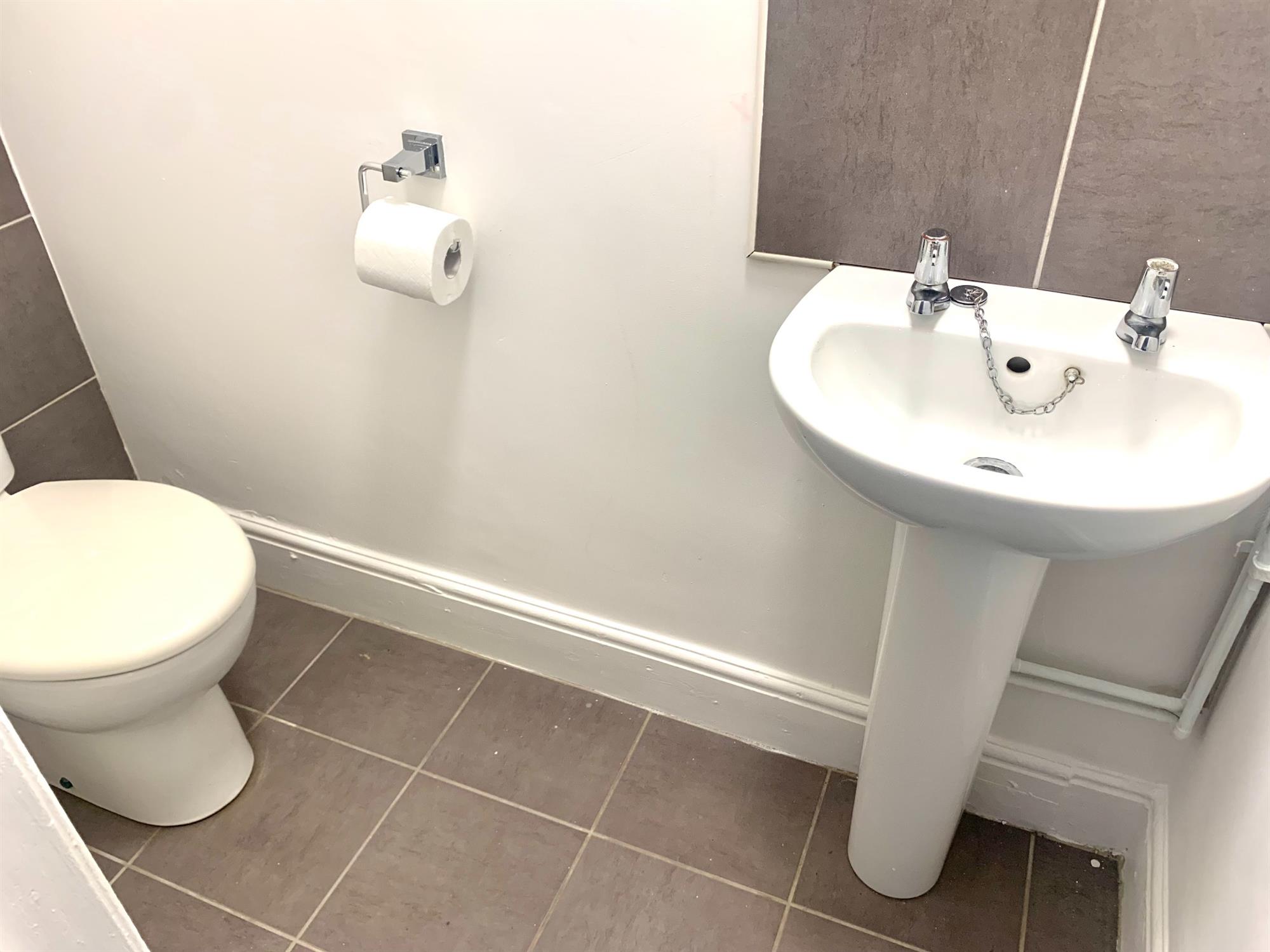 CLOAKROOM – White suite with toilet and sink.