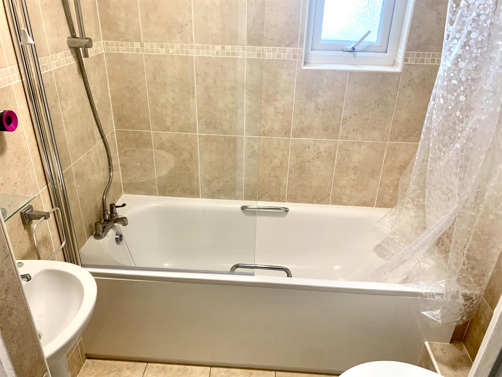 BATHROOM – White suite with bath with shower over, sink and toilet. Window to side.