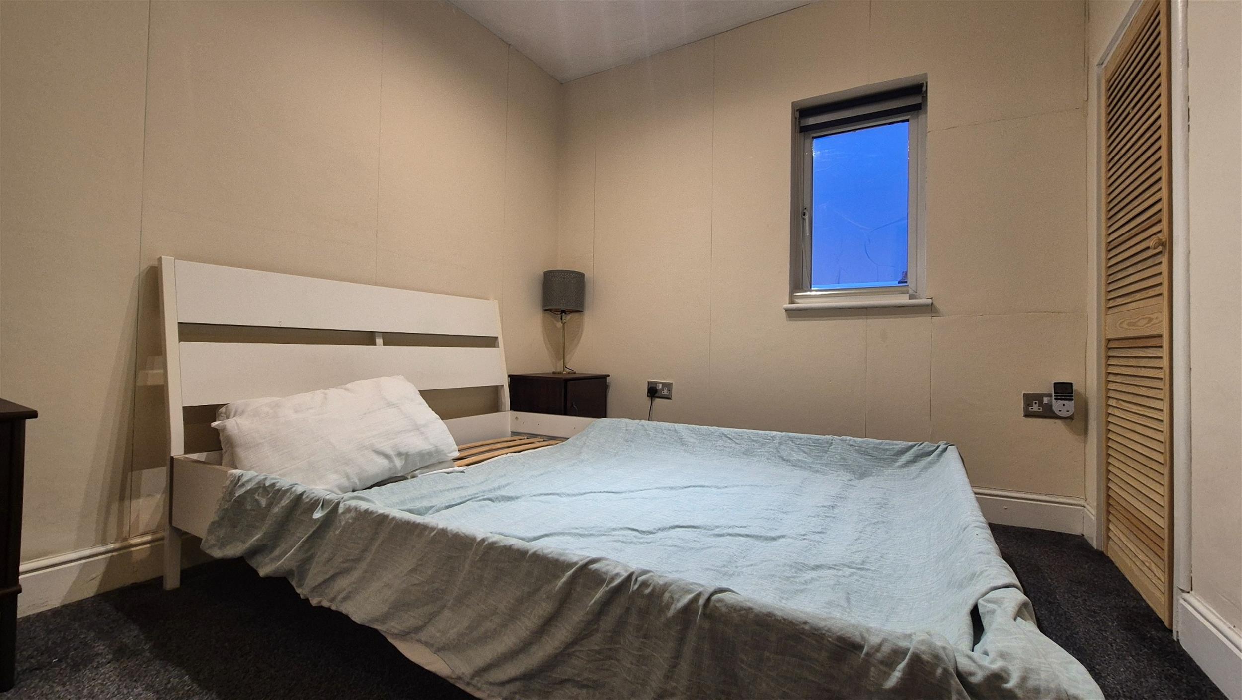Carpeted double bedroom with windows to front, built-in cupboard, double bed with mattress, and bed-side tables.