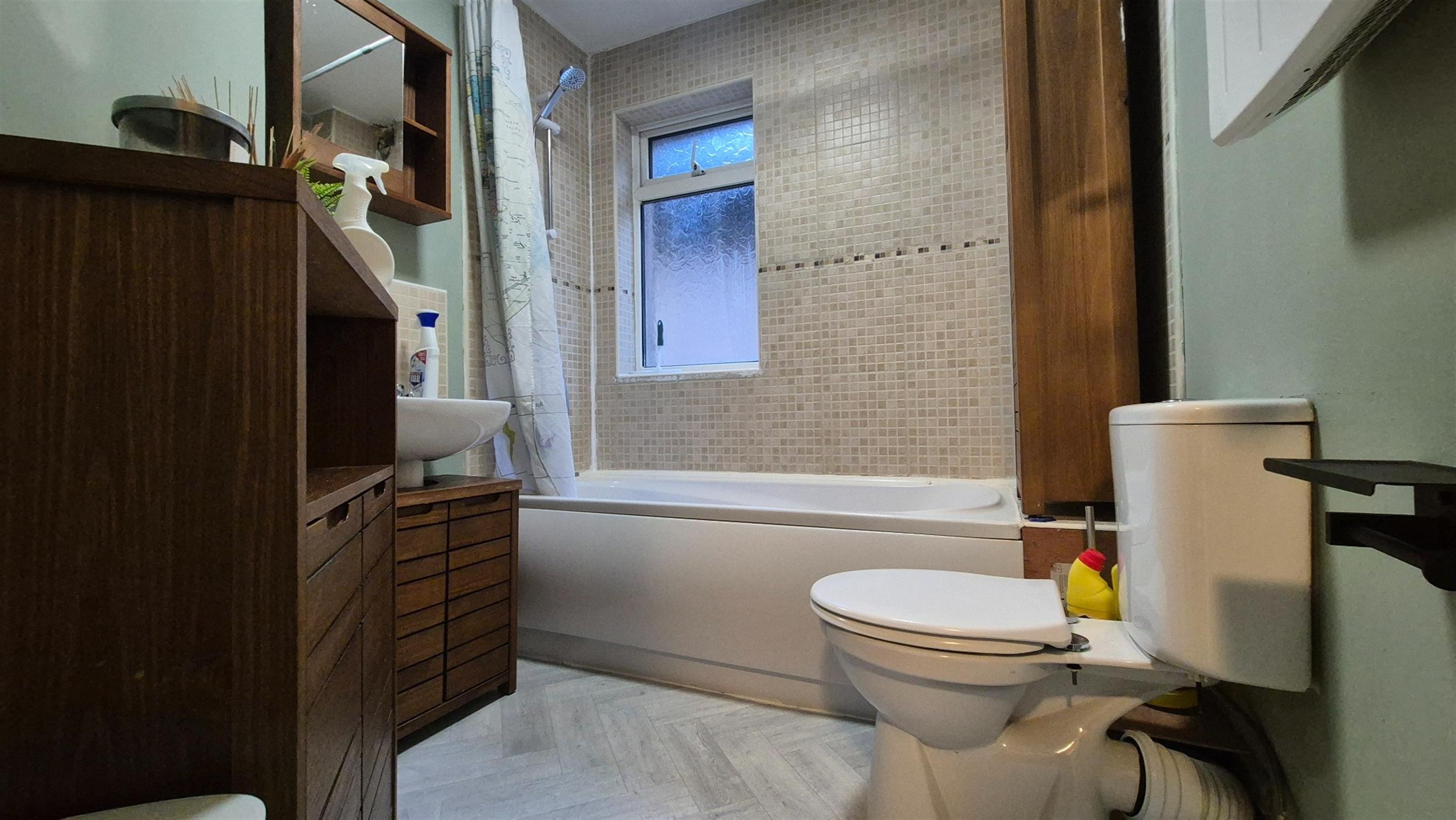 Laminate-floored room with toilet, sink, bath with over-head shower with window to side. Various units for storage. Window to side.