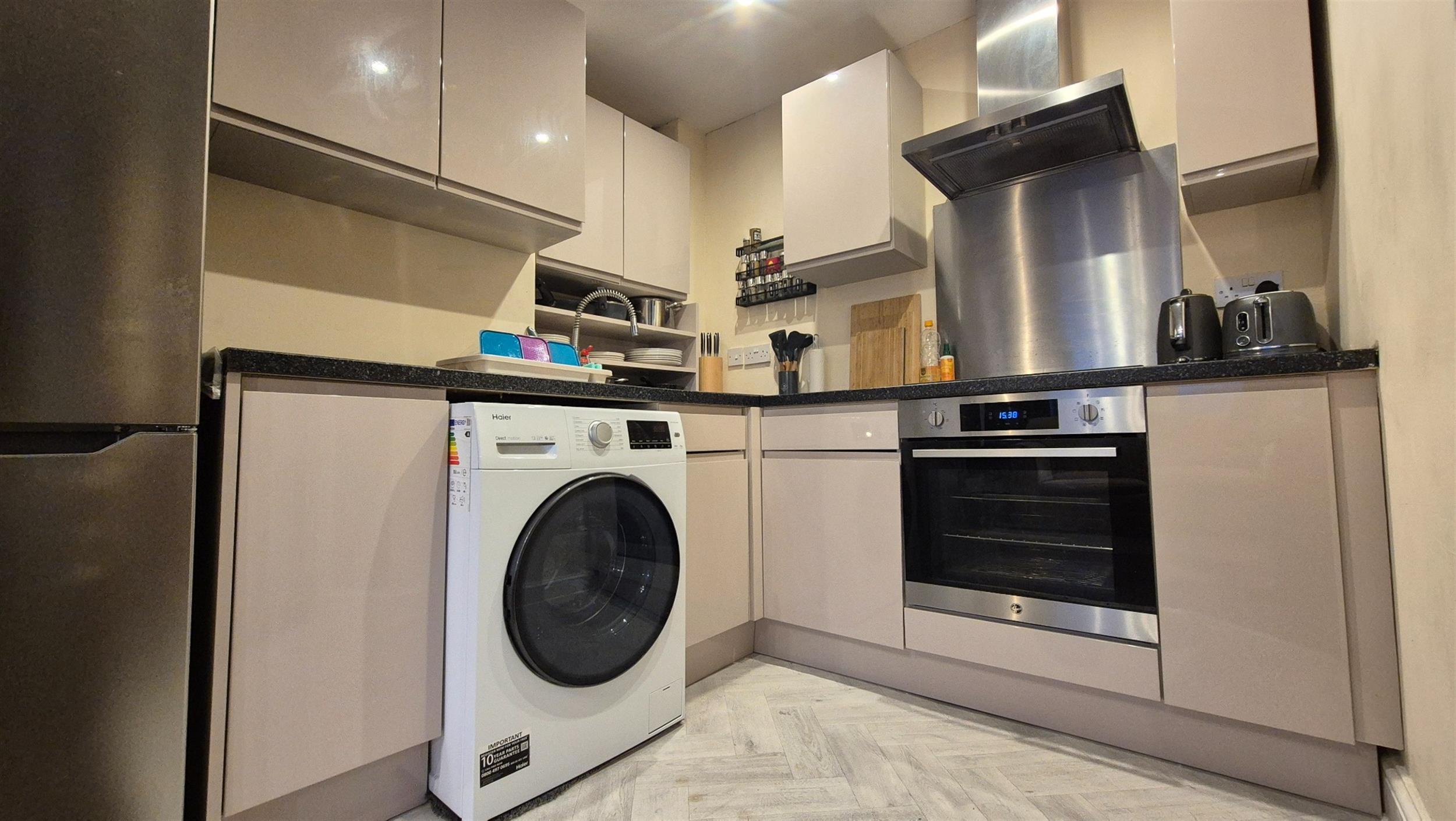 Modern kitchen with ample base-unit space, electric cooker, electric hob, washing machine and fridge/freezer.