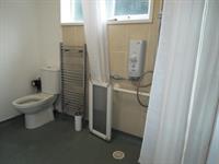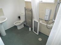 BATHROOM: White suite shower room with walk in shower with electric shower, toilet and sink.