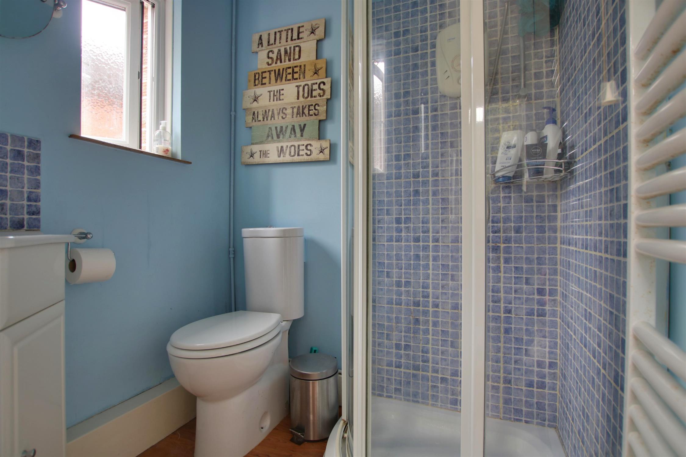 Wood effect laminate flooring. Obscure double glazed window to side. Enclosed shower cubicle with electric shower unit over, w.c. and ceramic corner wash basin with storage under. Heated towel rail. Smooth walls and ceiling. Tiling to principal areas.