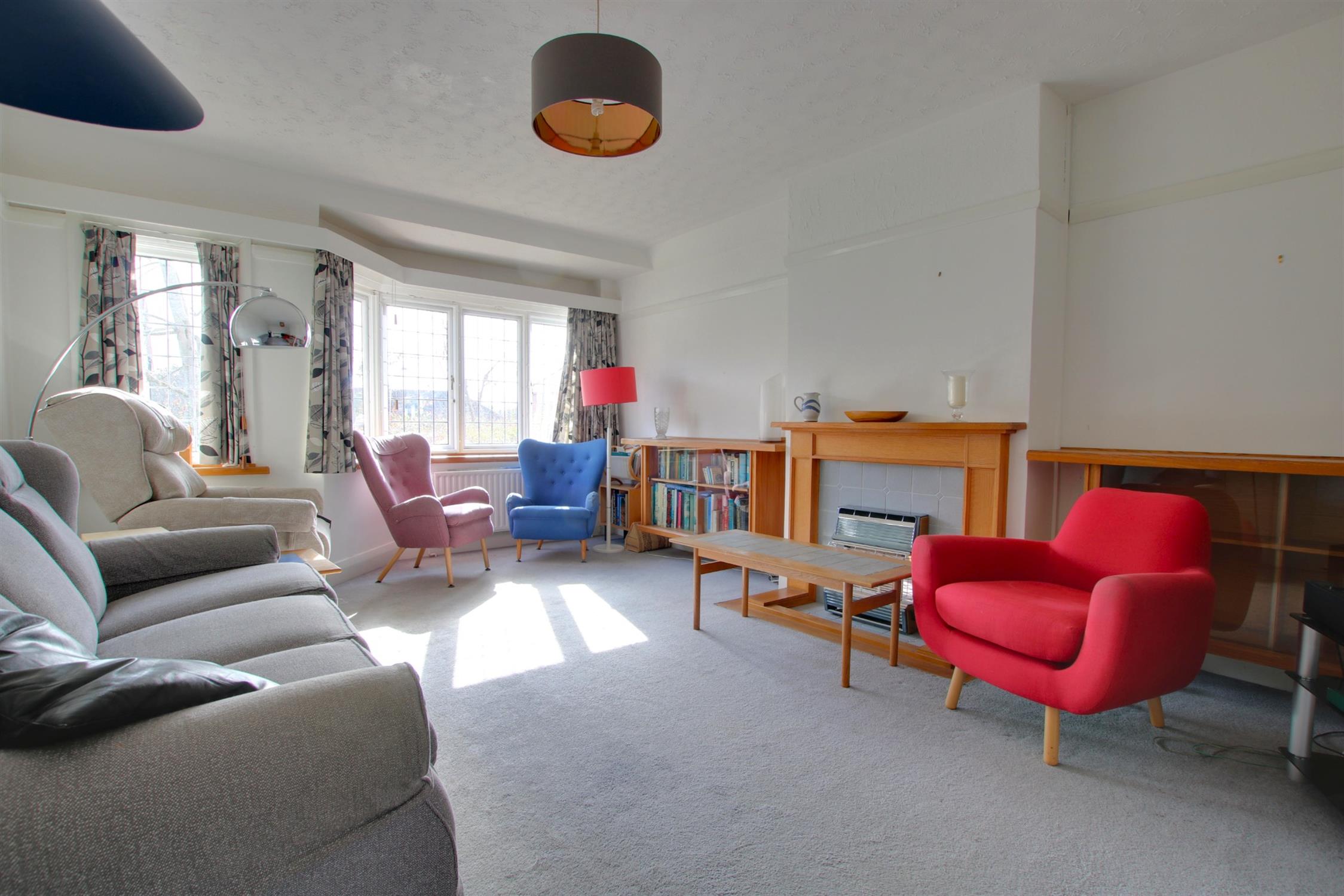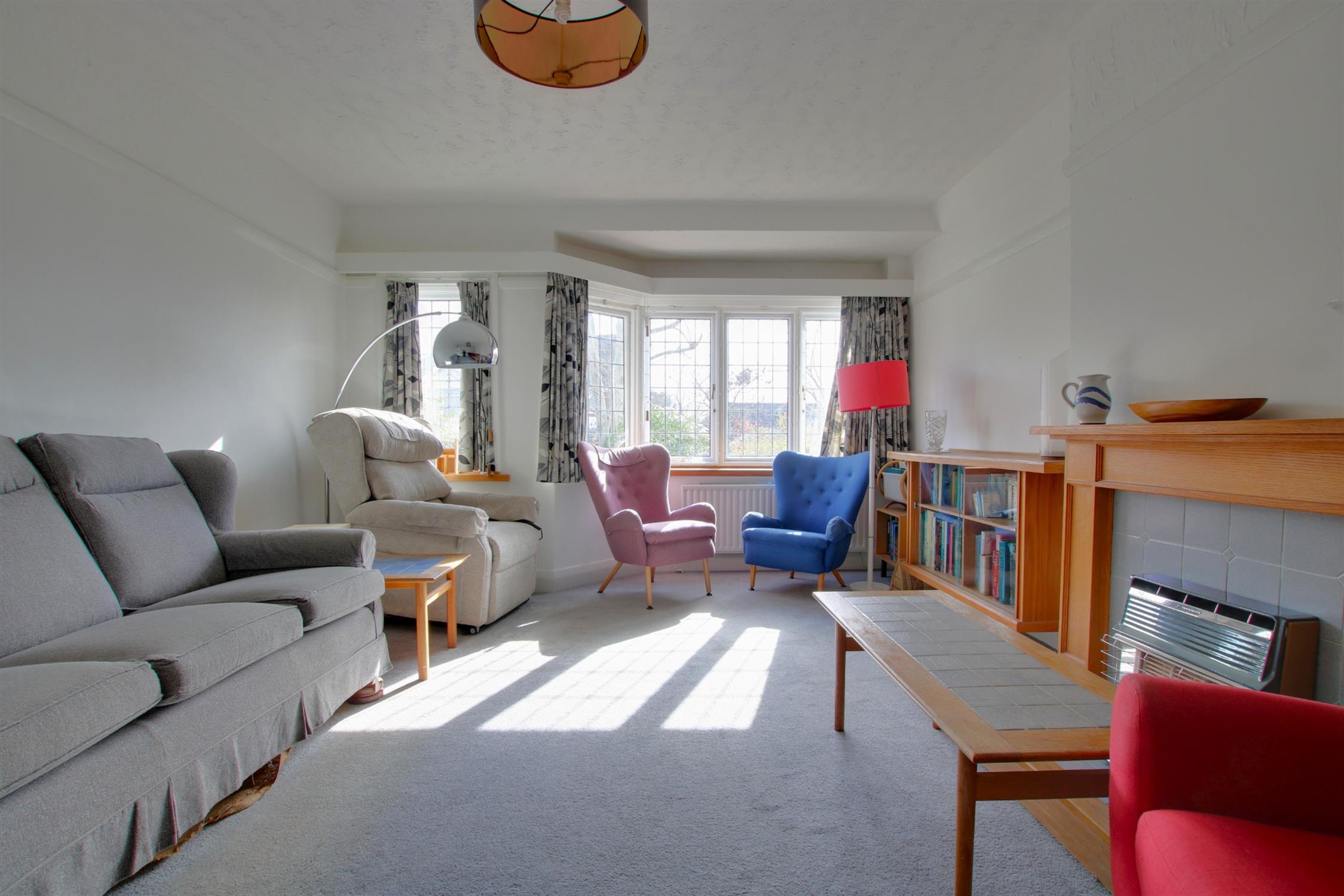 Carpeted. Picture rails and deep skirting boards. Wall-mounted gas fire. Single-glazed window and single-glazed bay window to front aspect. Two radiators.