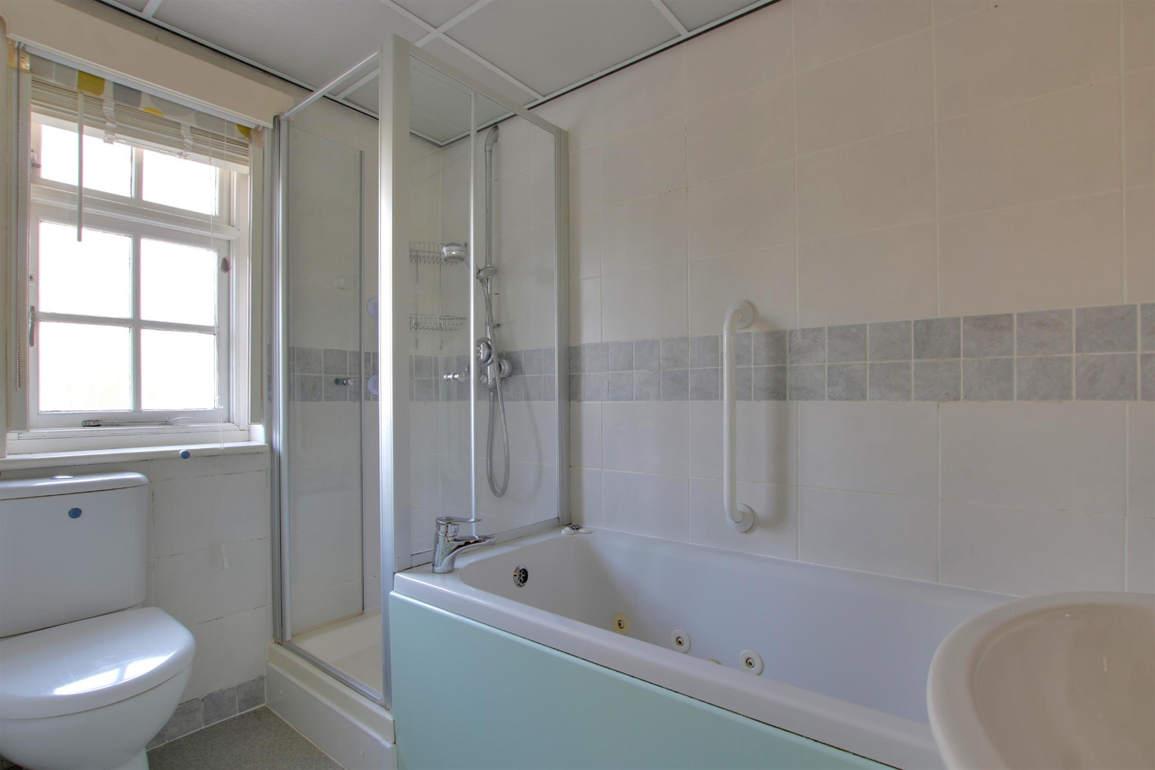 Vinyl flooring. Partially tiled walls. Panel enclosed bath. Shower cubicle. Low level W.C and wash basin. Extractor fan. Obscure single-glazed window to rear aspect. Heated towel rail.