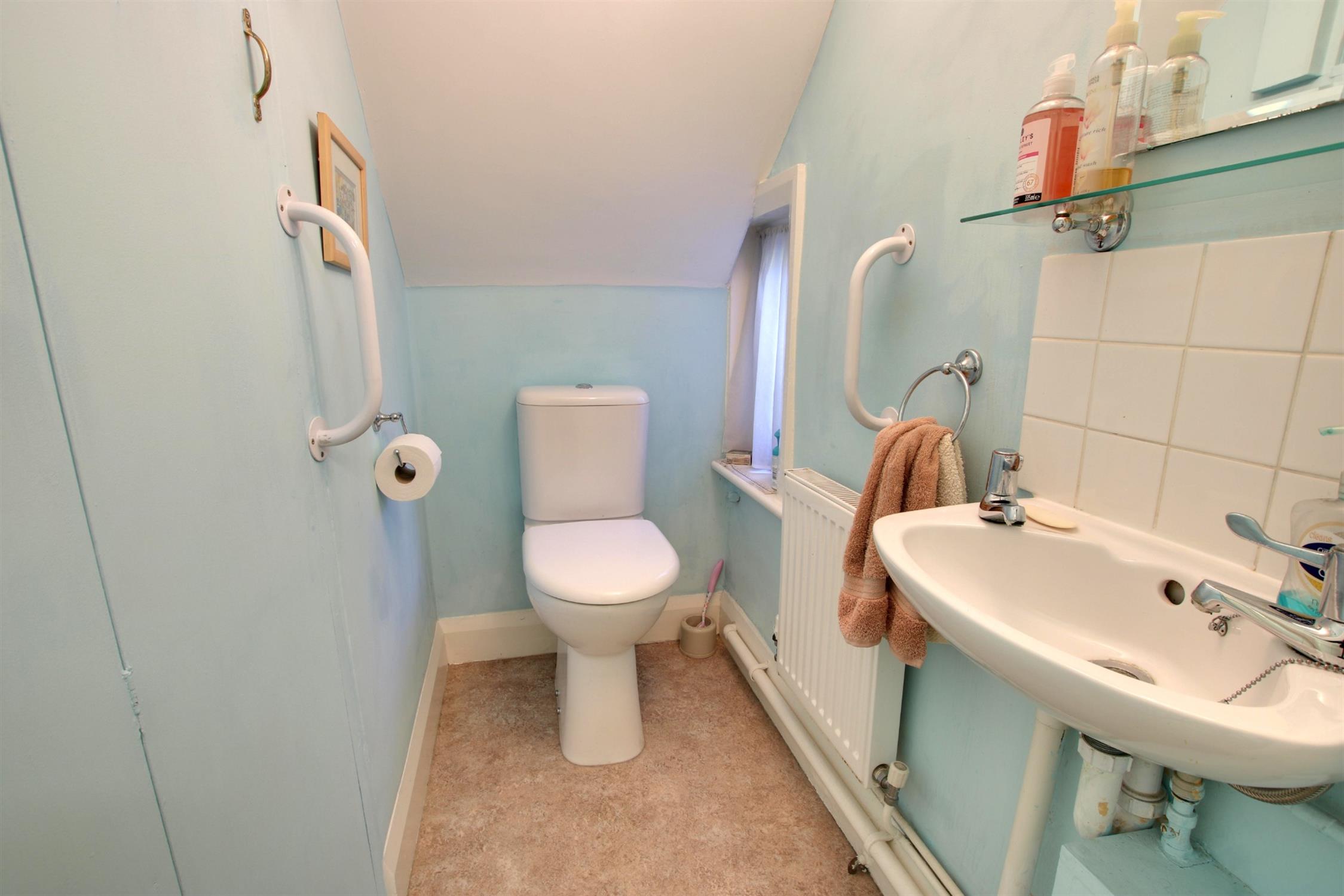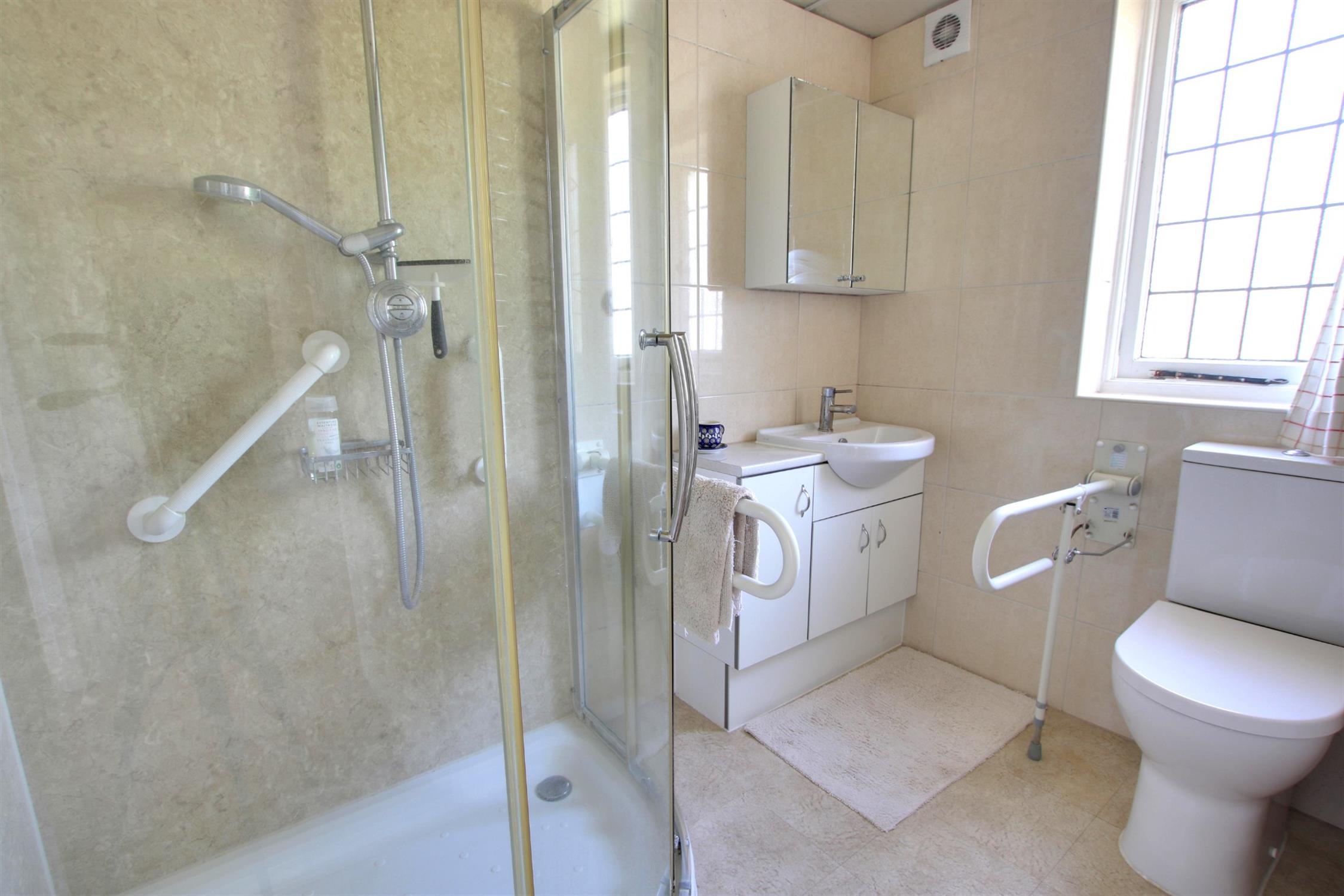 Tiled walls and flooring. Corner shower cubicle. Low level W.C and wash basin with cabinets. Extractor fan. Obscure single-glazed window to rear aspect. Heated towel rail.