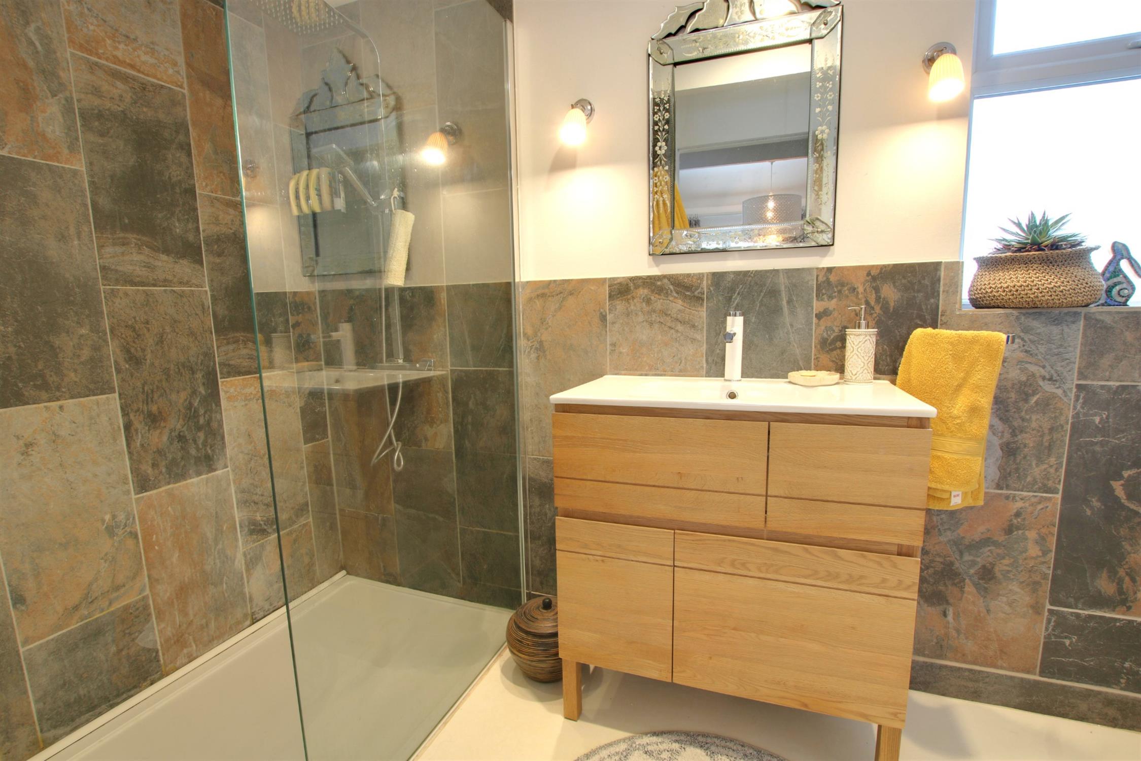 Tiled flooring and part tiled walls. Smooth Ceiling, double shower cubicle with glass screen and shower attachments, low level wc, vanity wash hand basin, heated towel rail, double glazed window to rear elevation.
