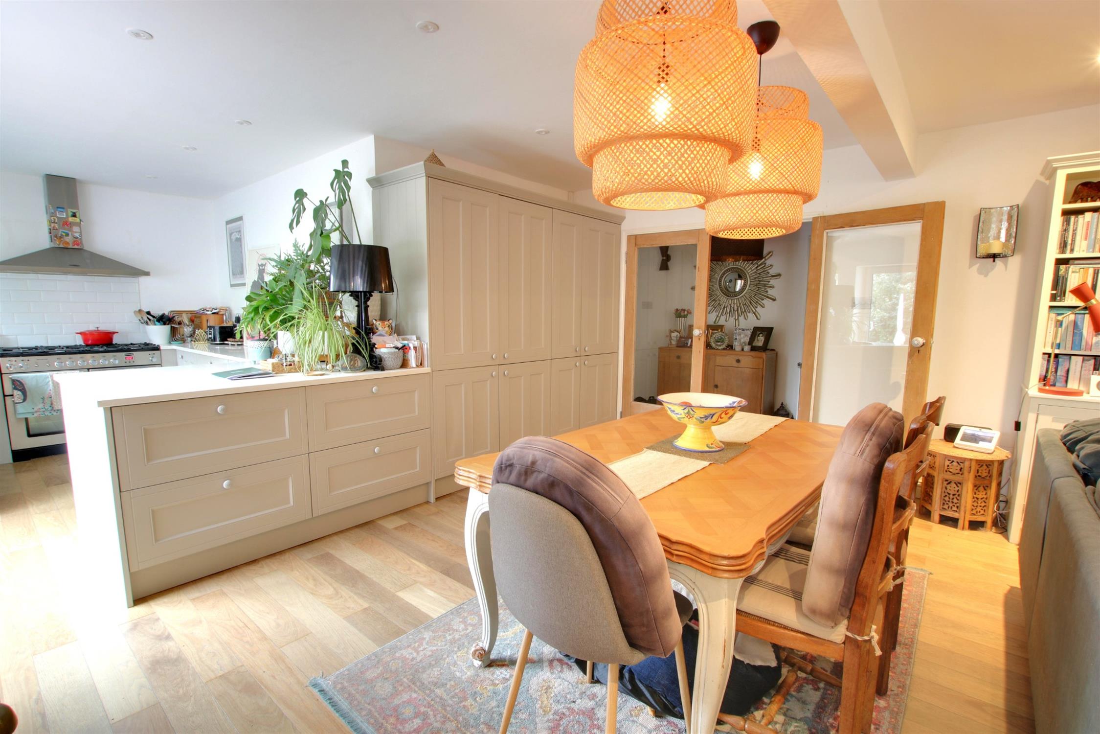 Wooden Flooring, smooth walls and ceiling, Radiator, double glazed windows and bi-fold patio doors opening onto the garden, Space for dining table, range of wall and ceiling lighting. Fitted kitchen units with built in appliances including dishwasher and fridge/freezer. Space for range style gas cooker with 6 ring hob and extractor over. White speckled granite work surfaces with inset sink and tiled splashback.