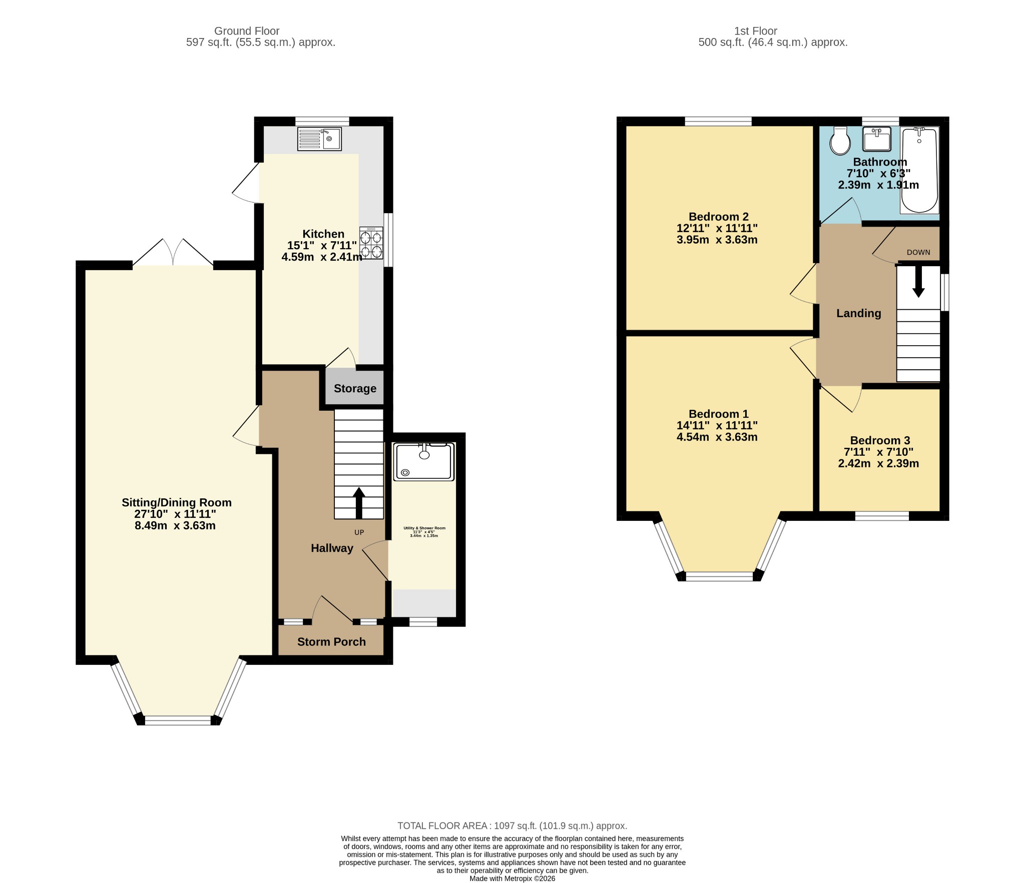 Bedroom one 14' 11" (4.54m) into bay x 11' 11" (3.63m)