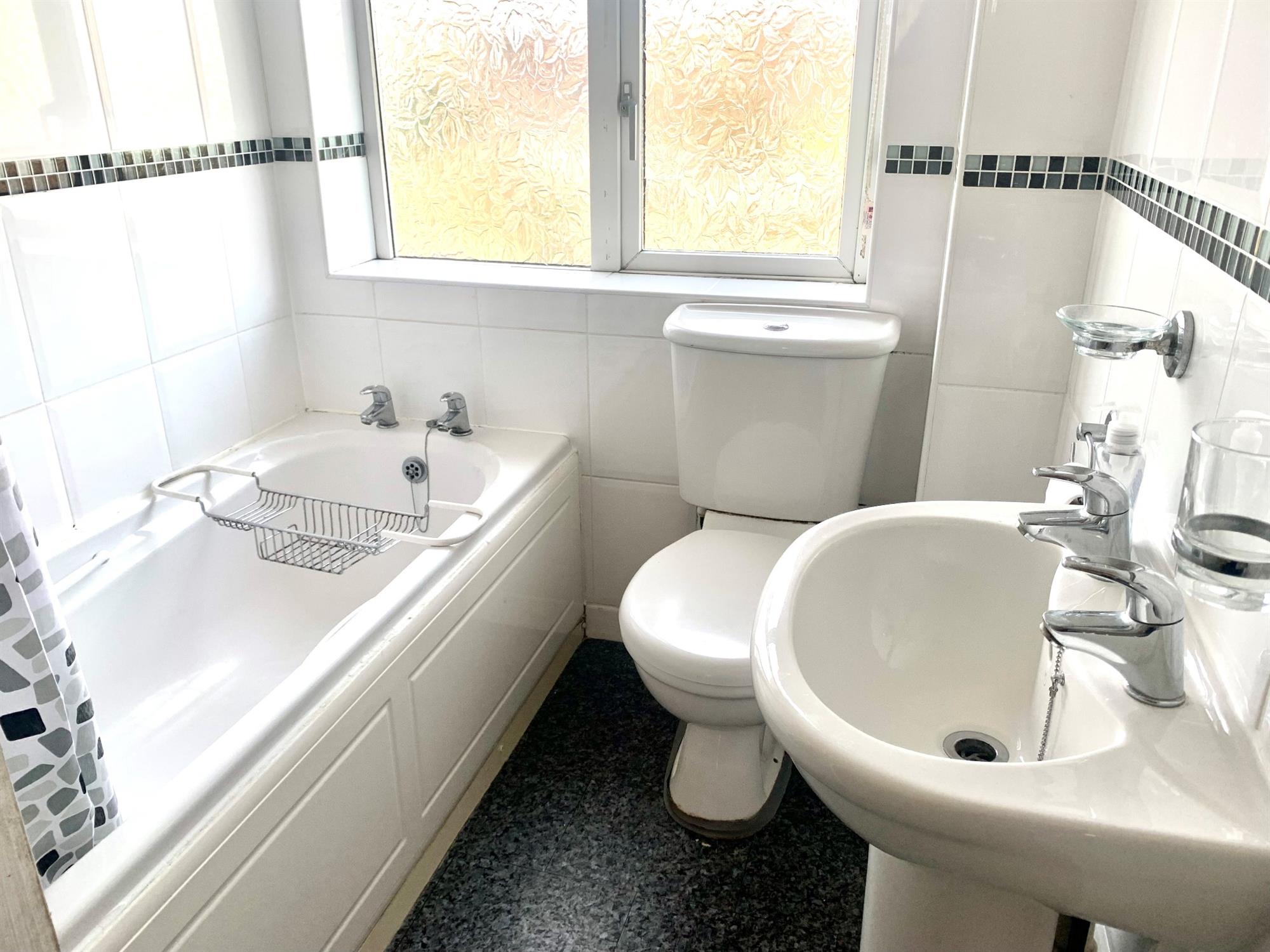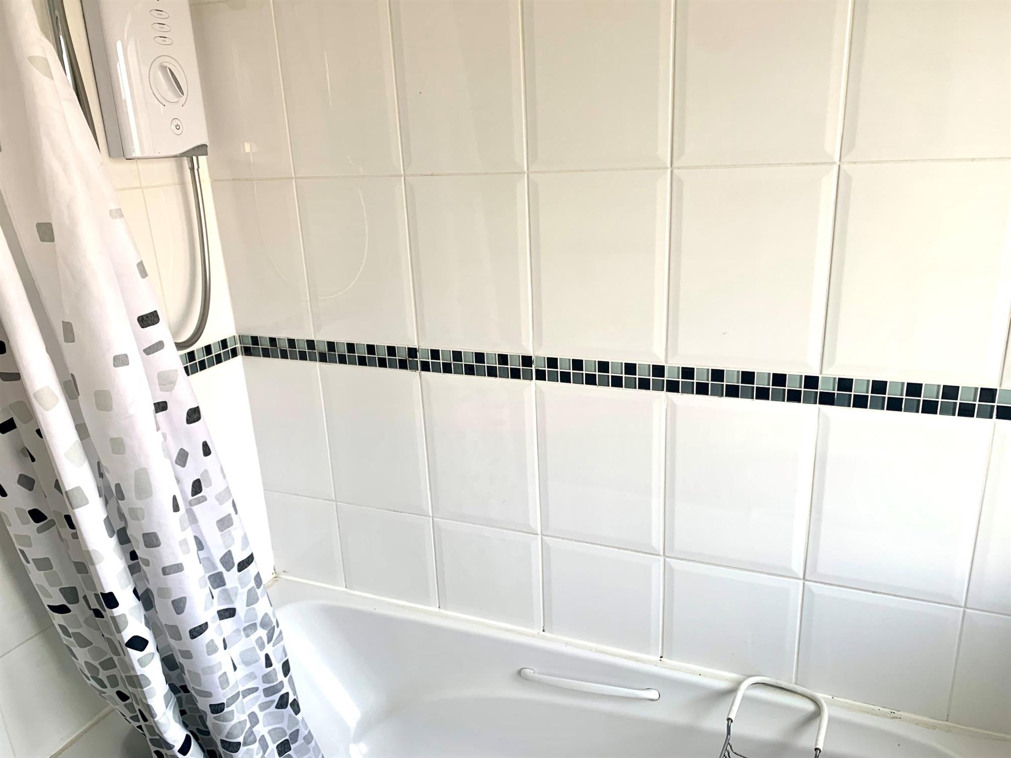 BATHROOM – White suite which includes, bath with electric shower over, toilet and sink. Window overlooking rear.