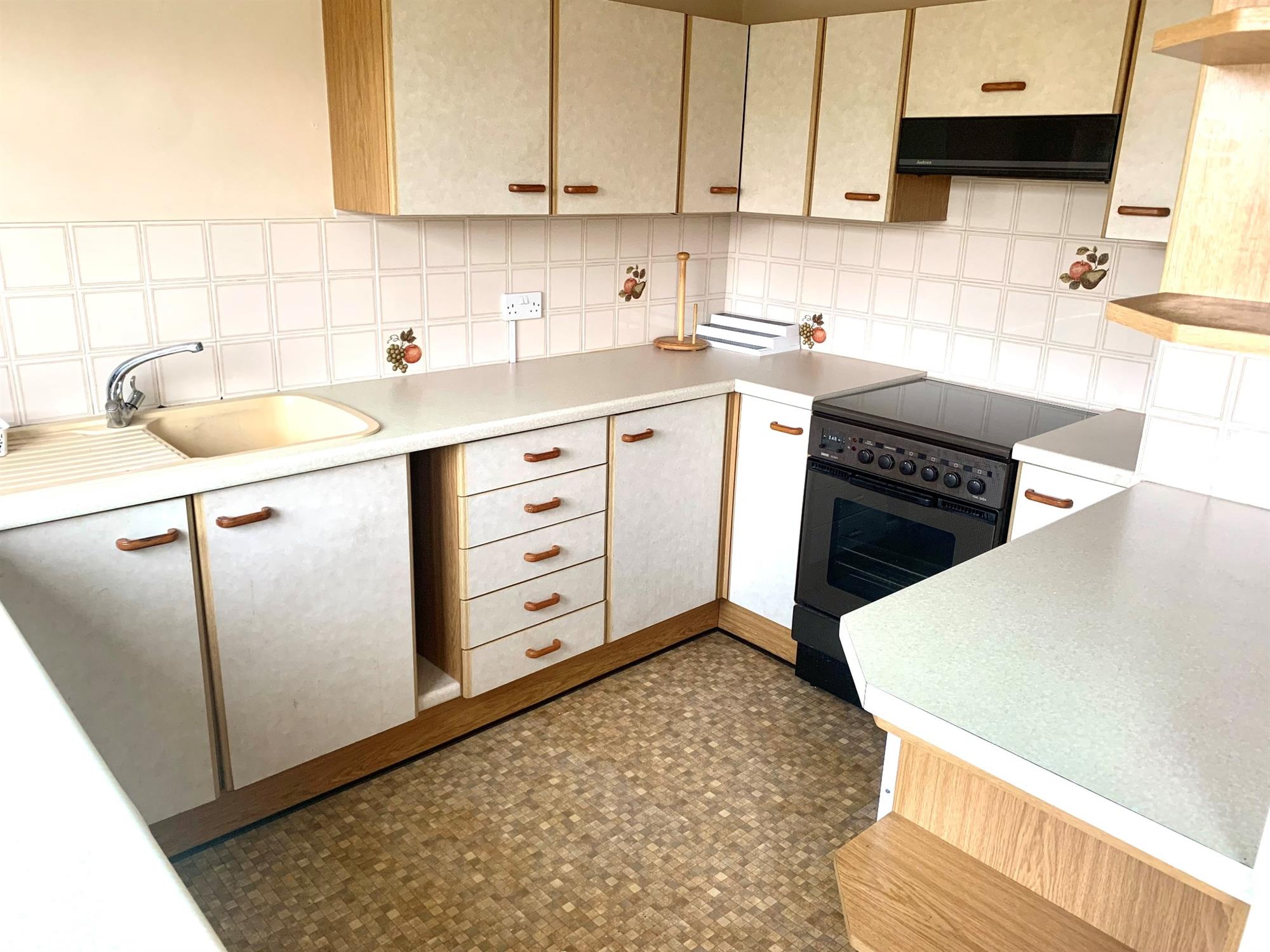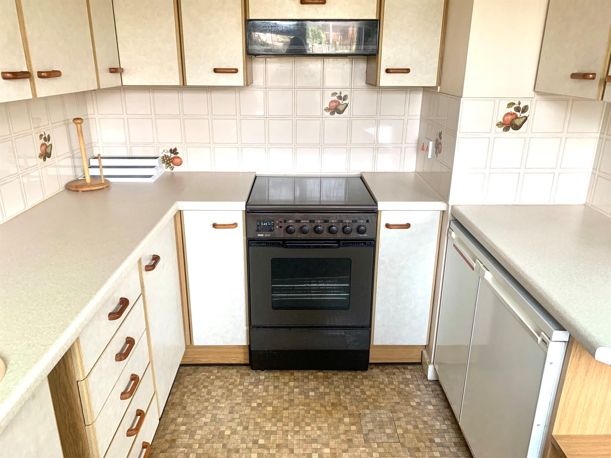KITCHEN - A traditional style kitchen with range of wall and base units. Appliances include: side by side fridge/freezer, washing machine and electric double oven. Window and door to the rear garden.
