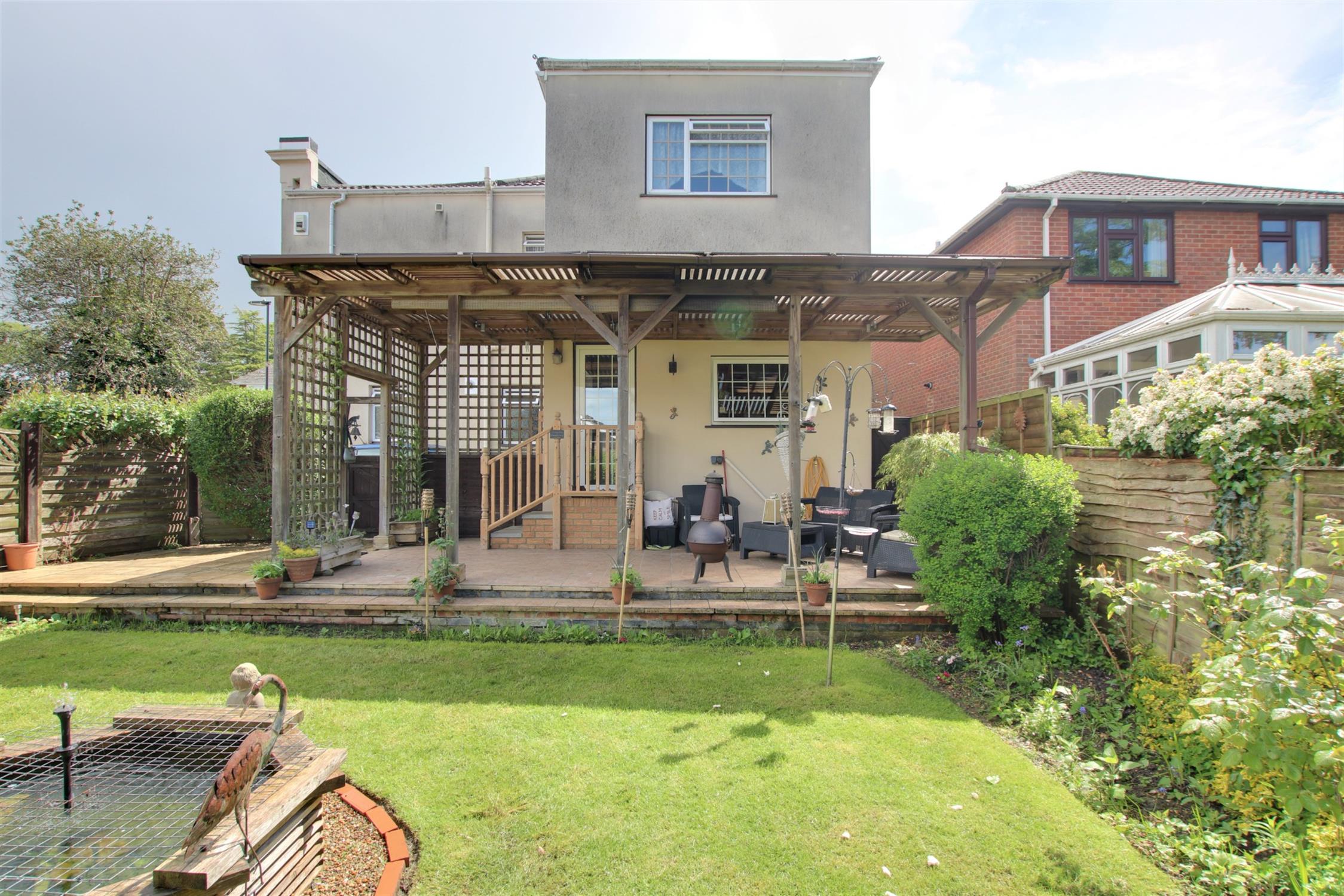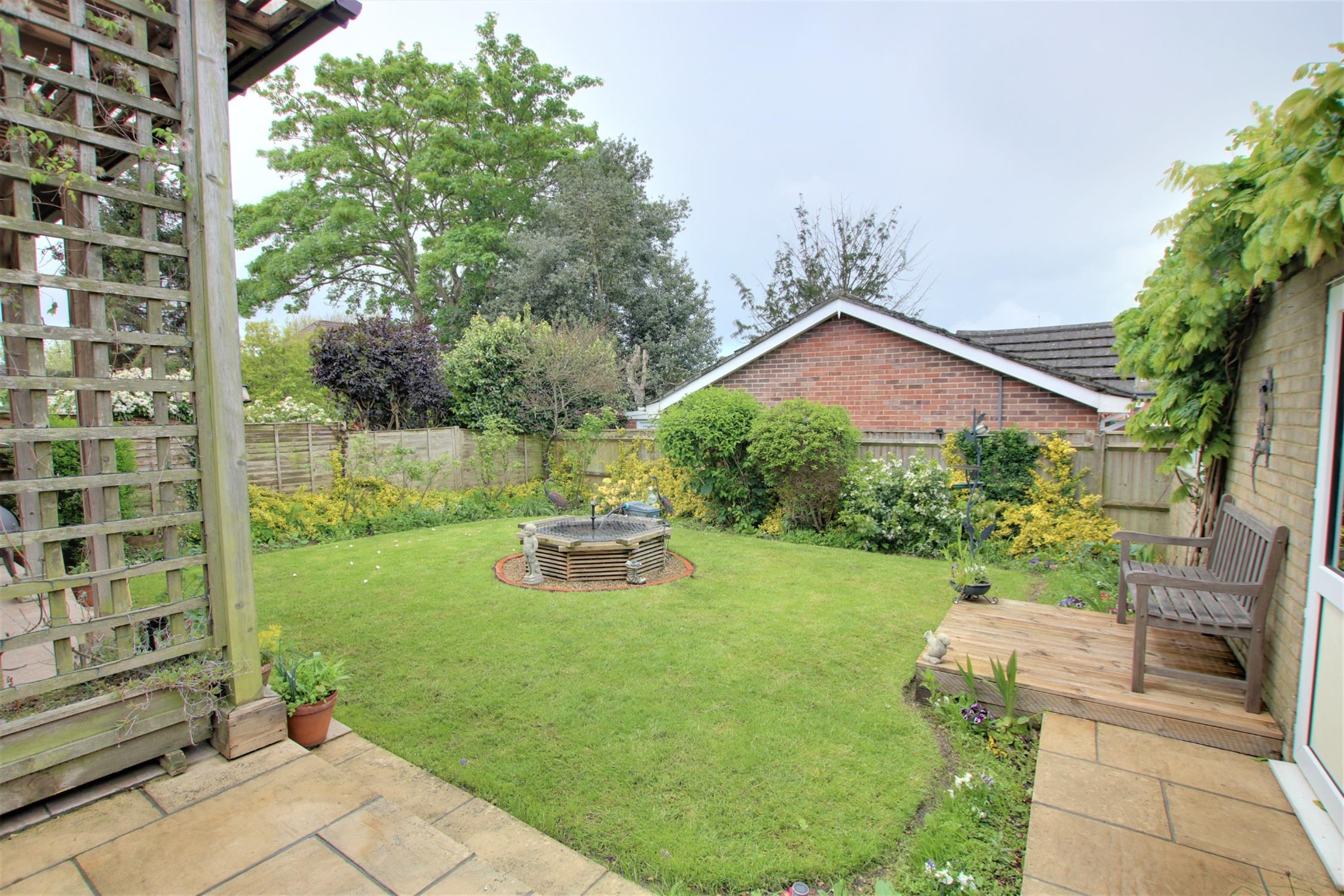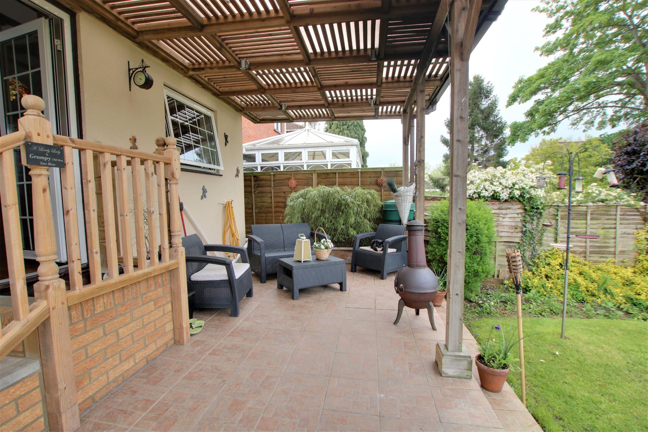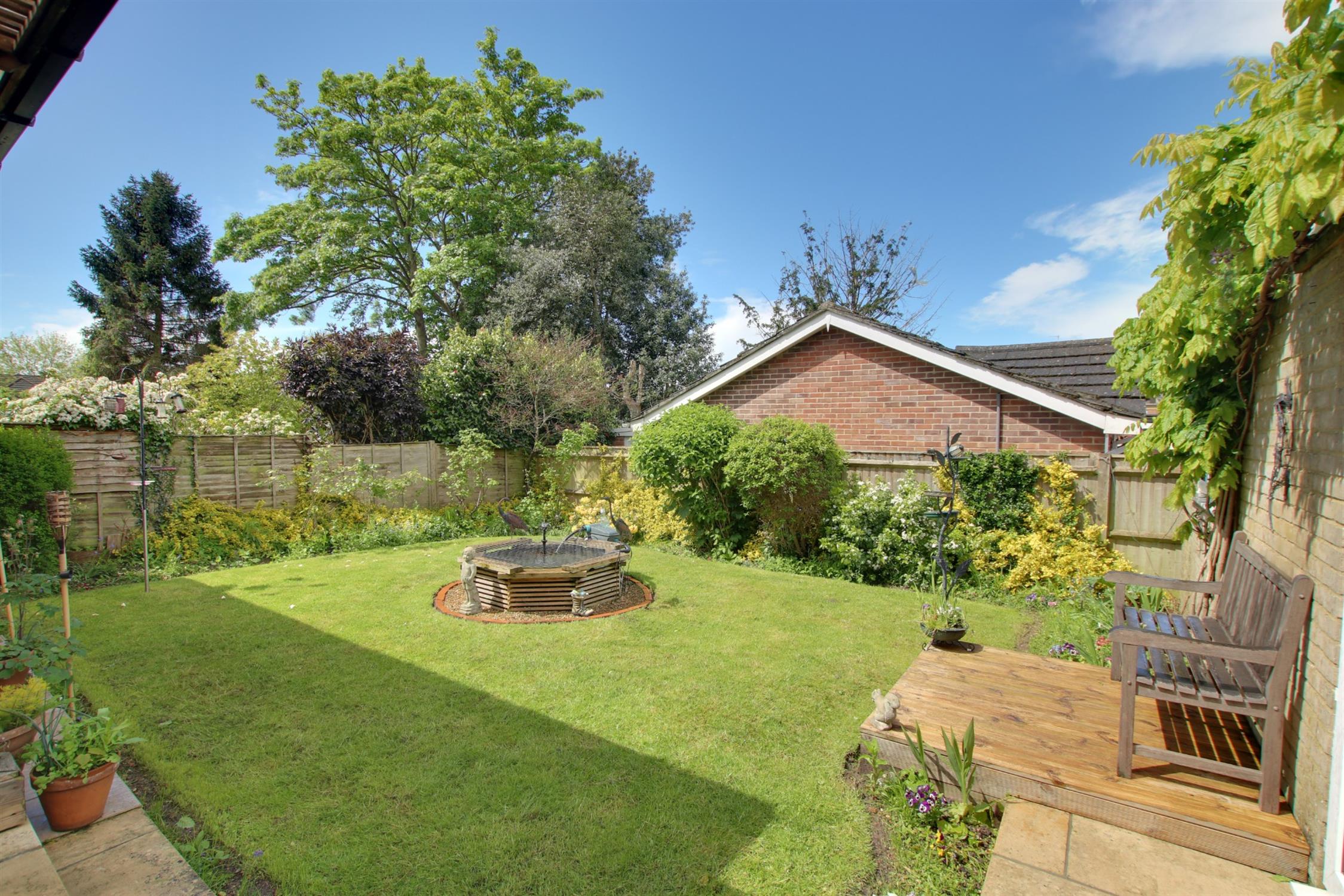 Gated pedestrian access to the rear garden with ornamental fish pond flower and shrub borders and a covered patio seating area. Outside tap. External power points.