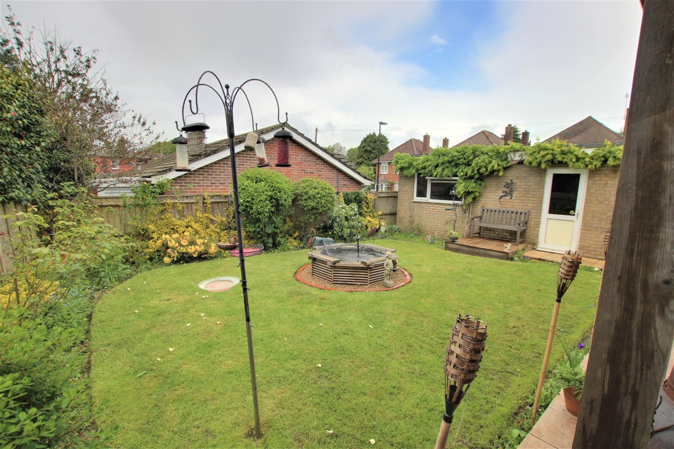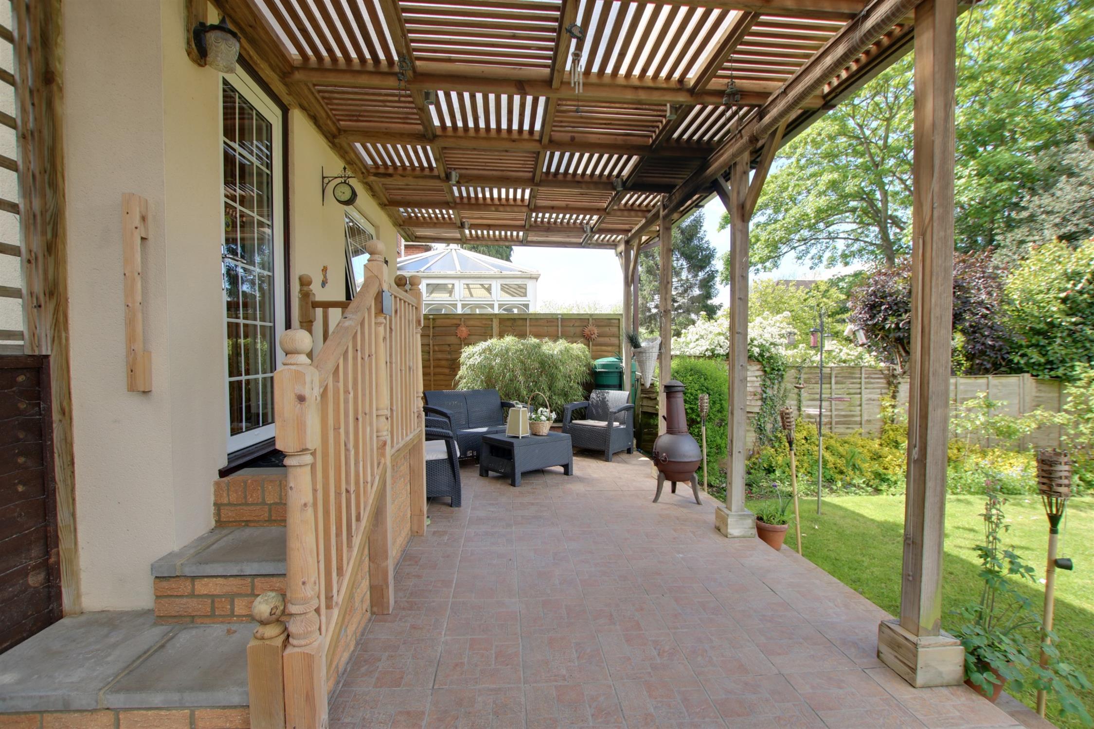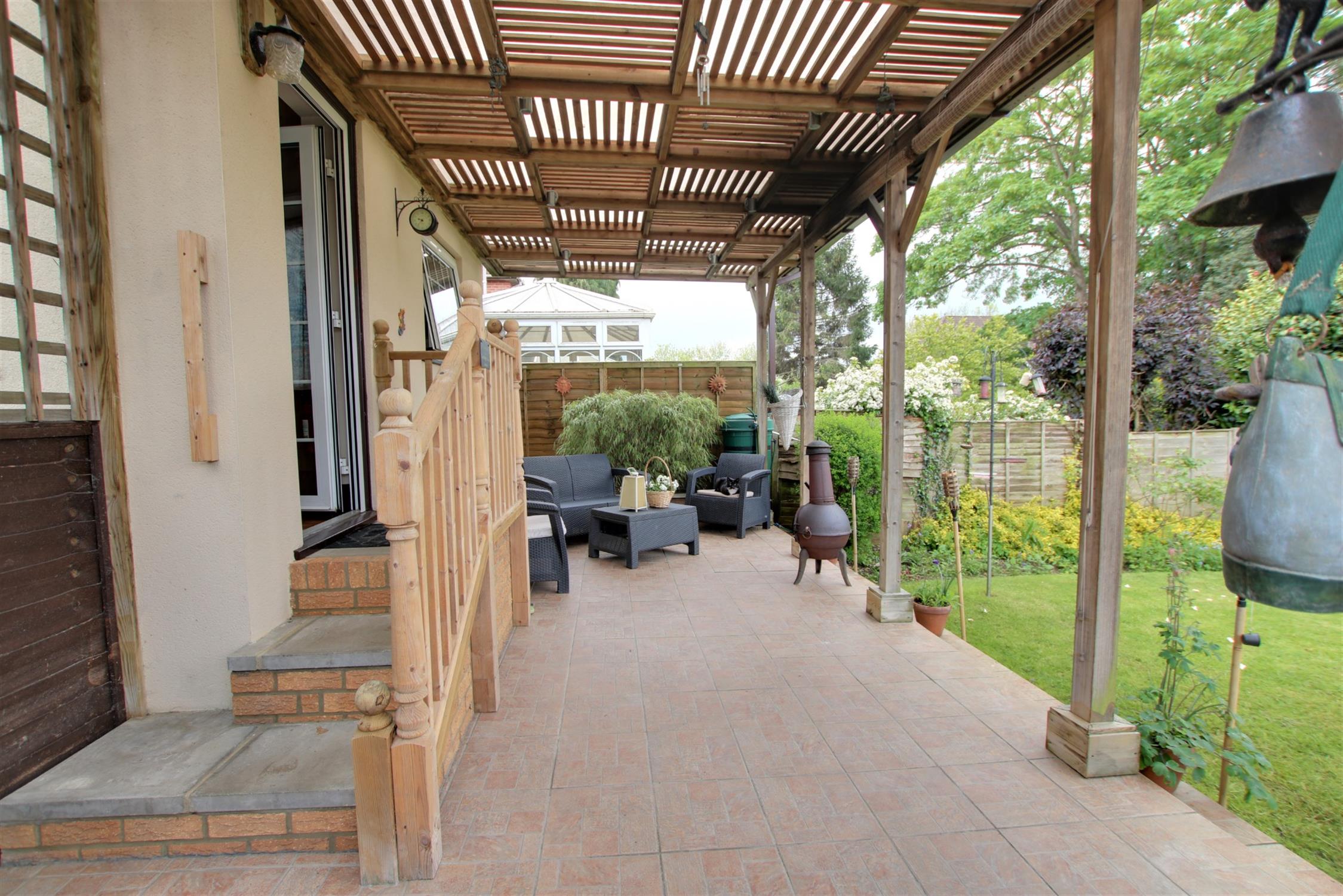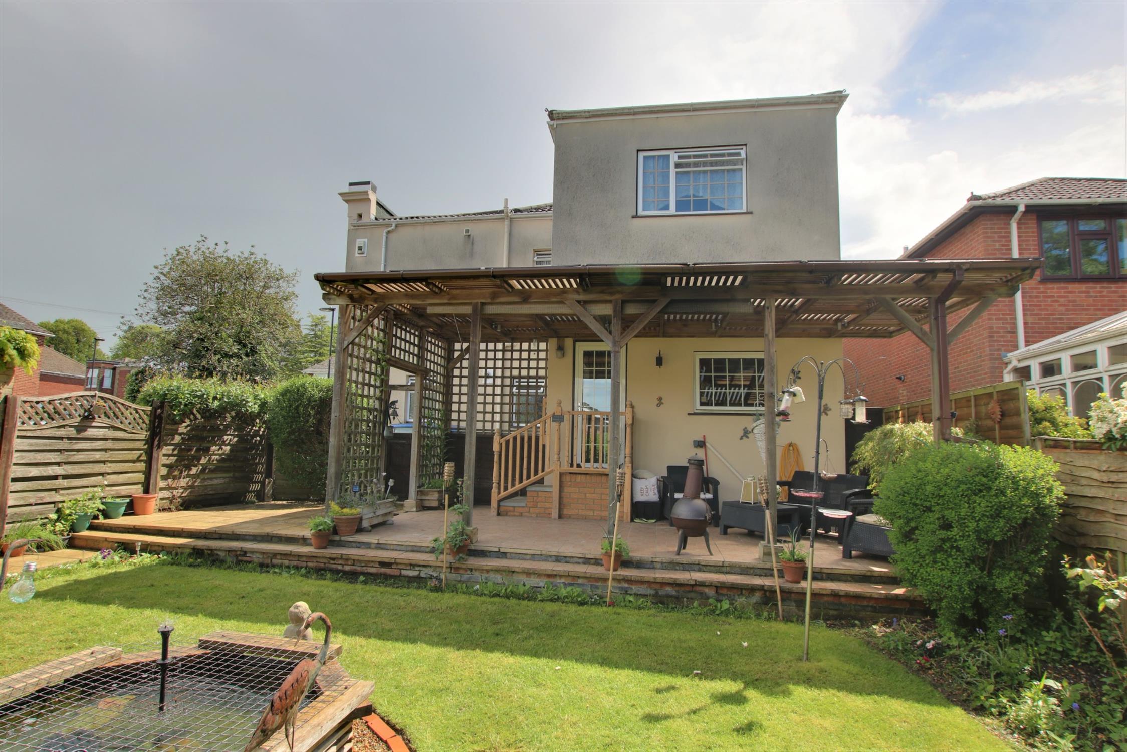 Gated pedestrian access to the rear garden with ornamental fish pond flower and shrub borders and a covered patio seating area. Outside tap. External power points.