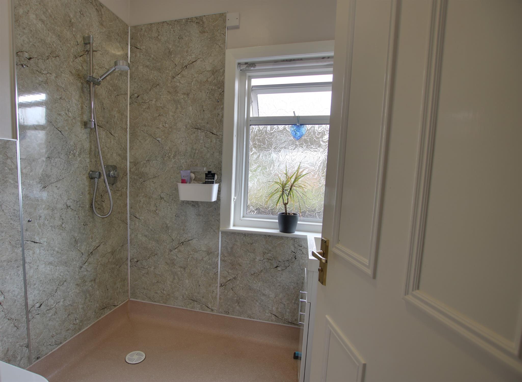 Double glazed obscure glass window to rear aspect. Wet room style shower, low level flush w.c. and vanity wash basin with mixer tap and cupboard under.