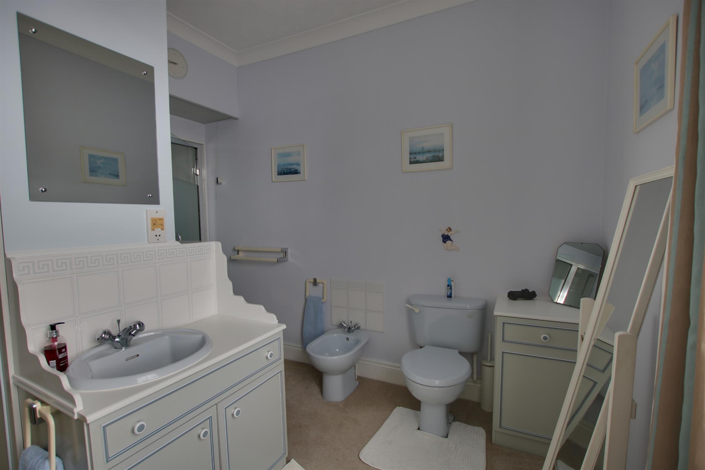 Triple glazed sash window to side aspect. Coving to textured ceiling. A range of fitted wardrobes. Vanity wash basin with mixer tap and cupboard under, low level flush w.c., bidet and tiled shower cubicle. Radiator.