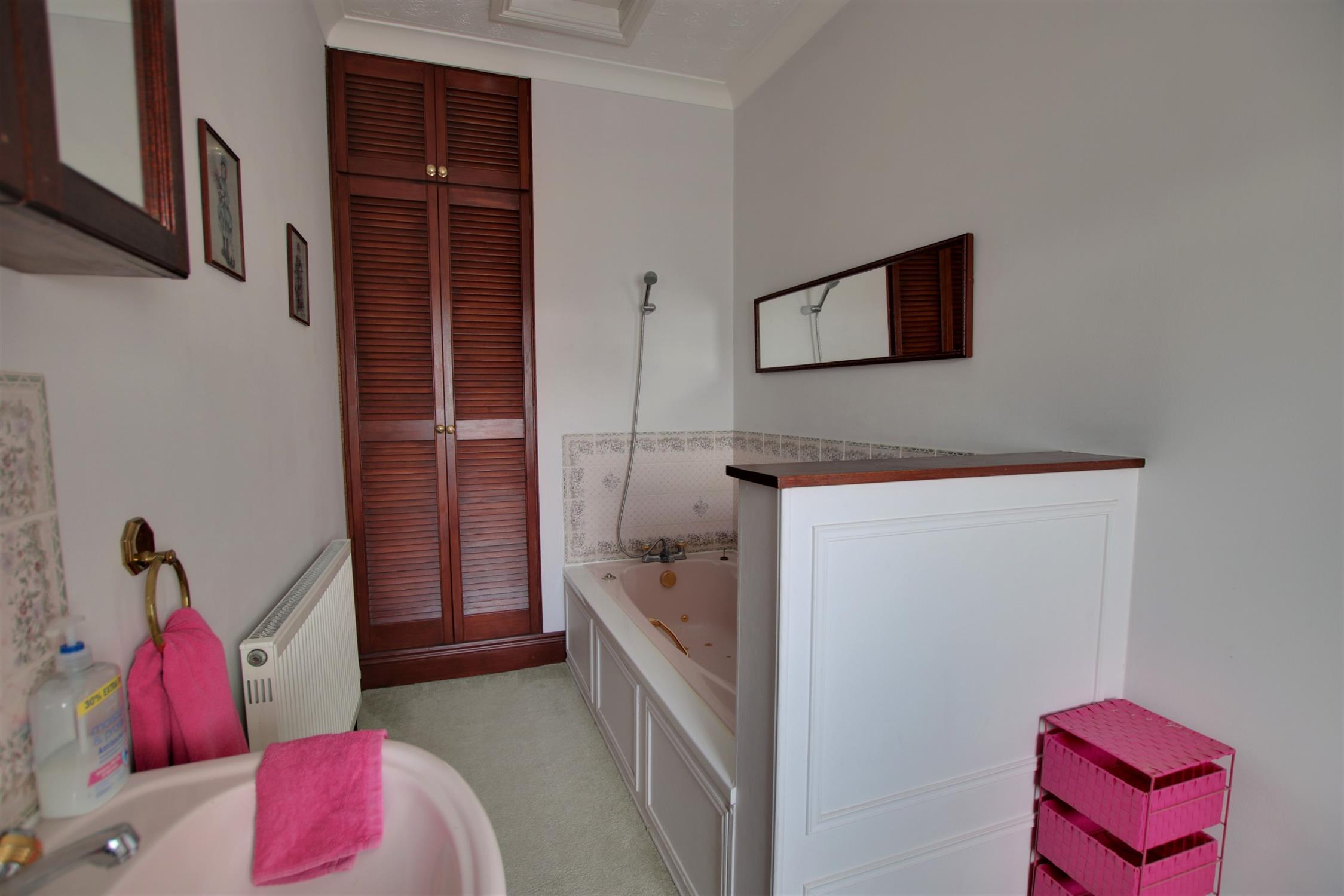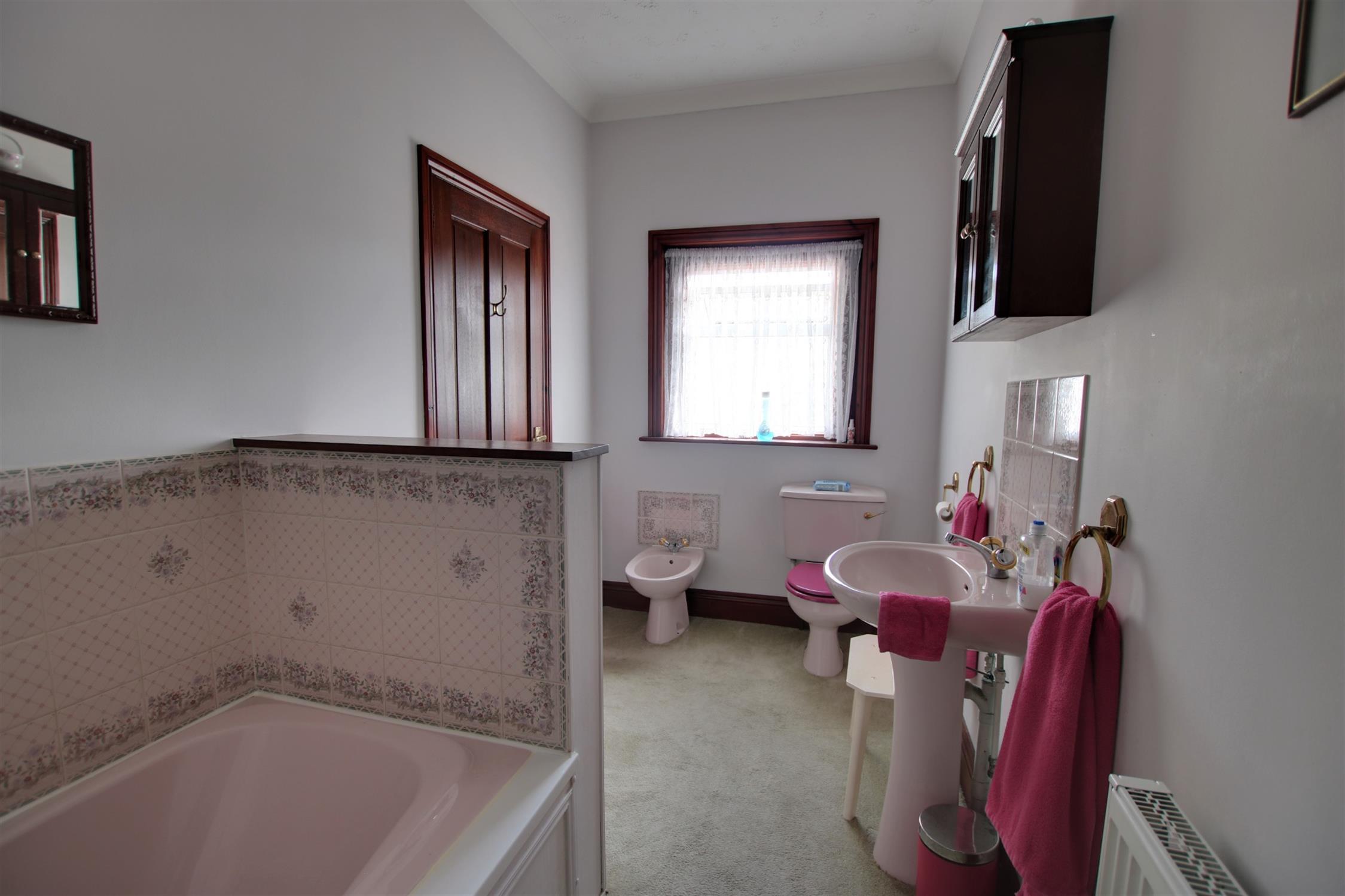 Double glazed obscure glass window to rear aspect. Coving to textured ceiling. Wash basin with mixer tap, low level flush w.c.. bidet and spa bath with mixer tap and shower attachment. Airing cupboard housing hot water tank.