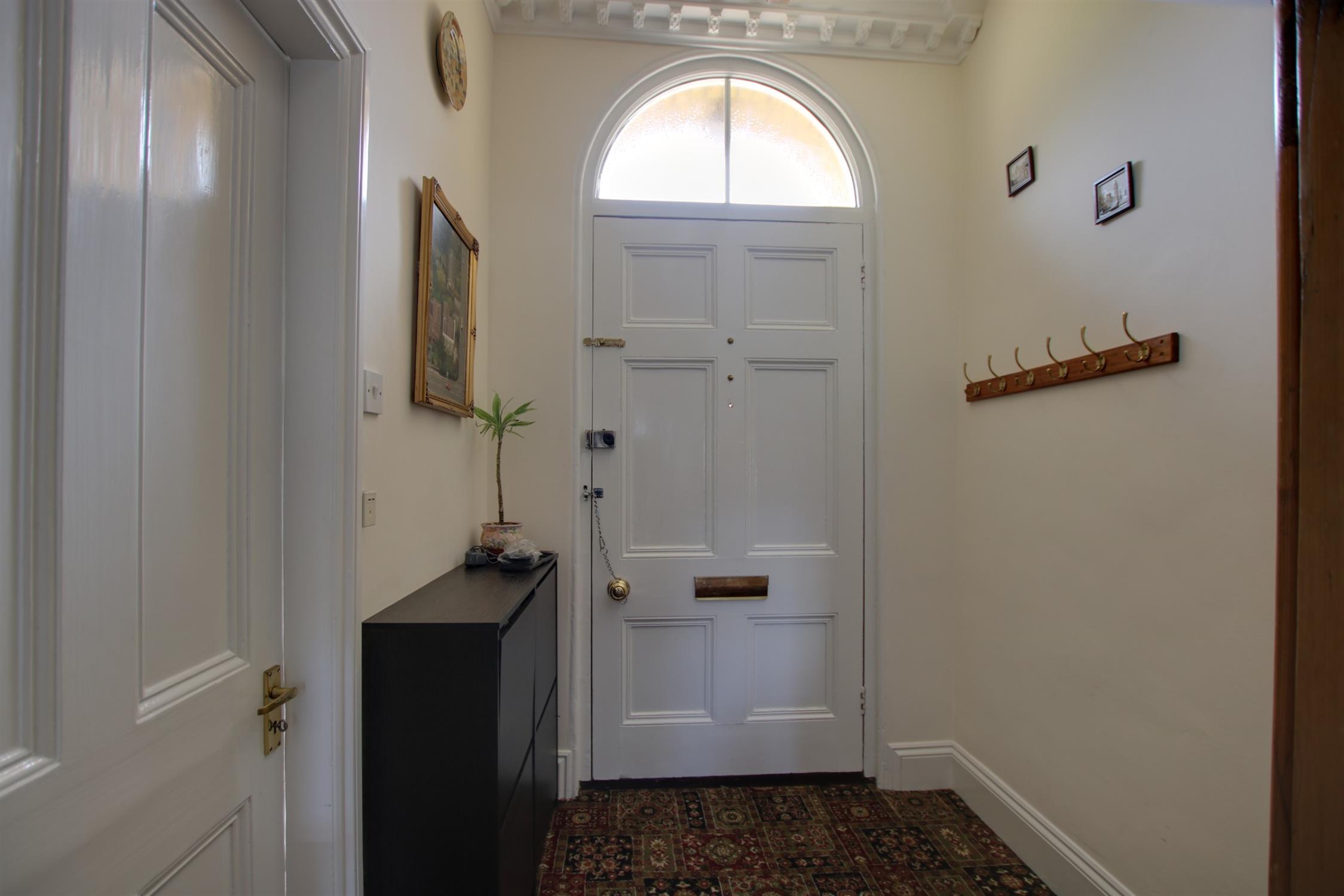 Plaster cornicing and ceiling rose. Smooth ceiling. Stairs to first floor. Under stairs storage cupboard. Radiator.