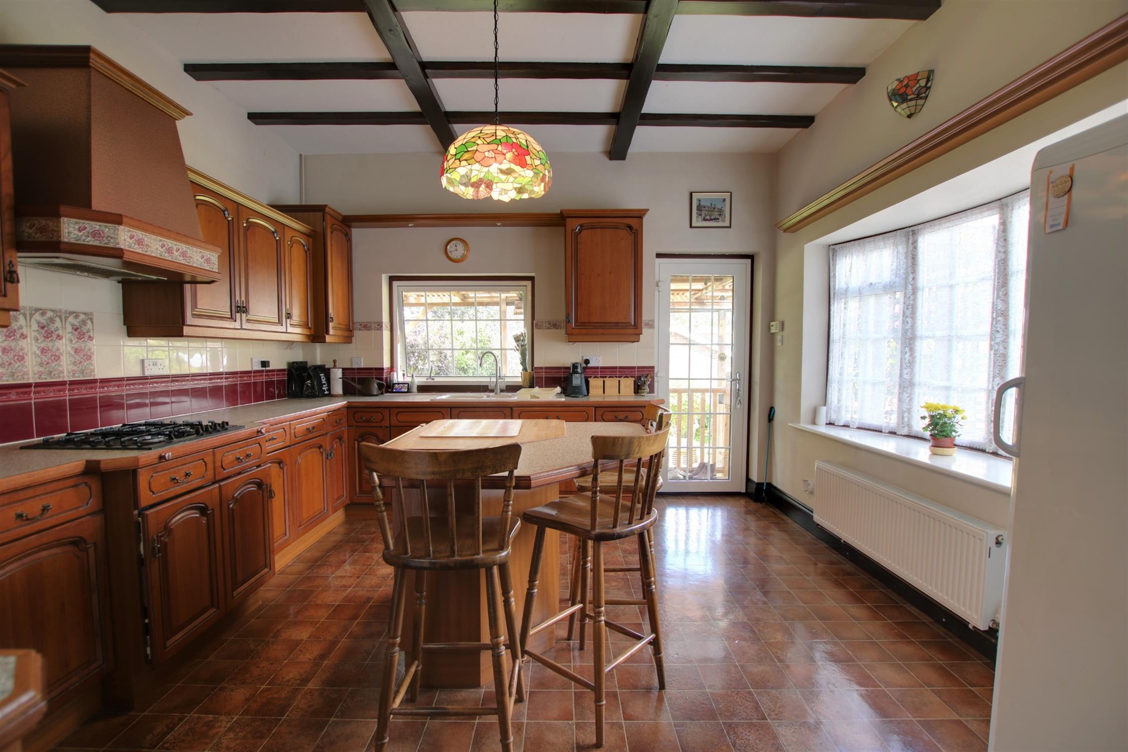 Double glazed bay window to side aspect. Double glazed window to rear aspect. Double glazed door opening onto rear garden. Textured ceiling. Radiator. Single drainer one and a half bowl sink unit with mixer tap and cupboard under. A range of matching eye level and base mounted units. Built-in double oven. Fitted four ring gas hob with extractor over. Part tiled walls.