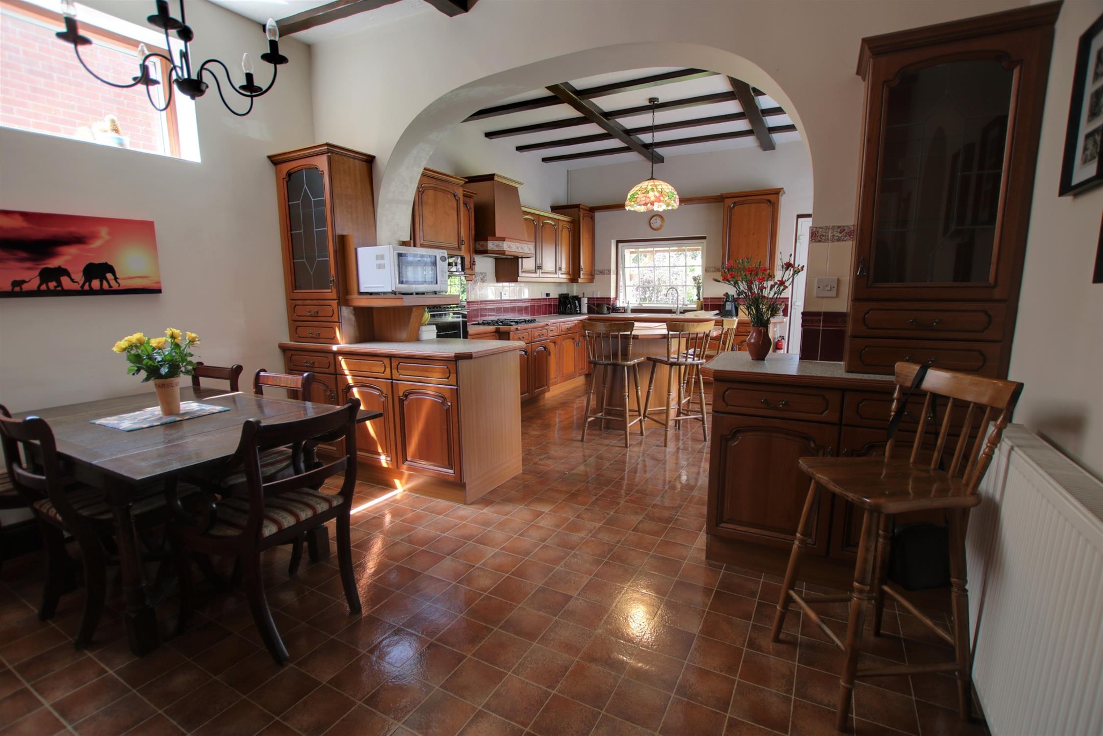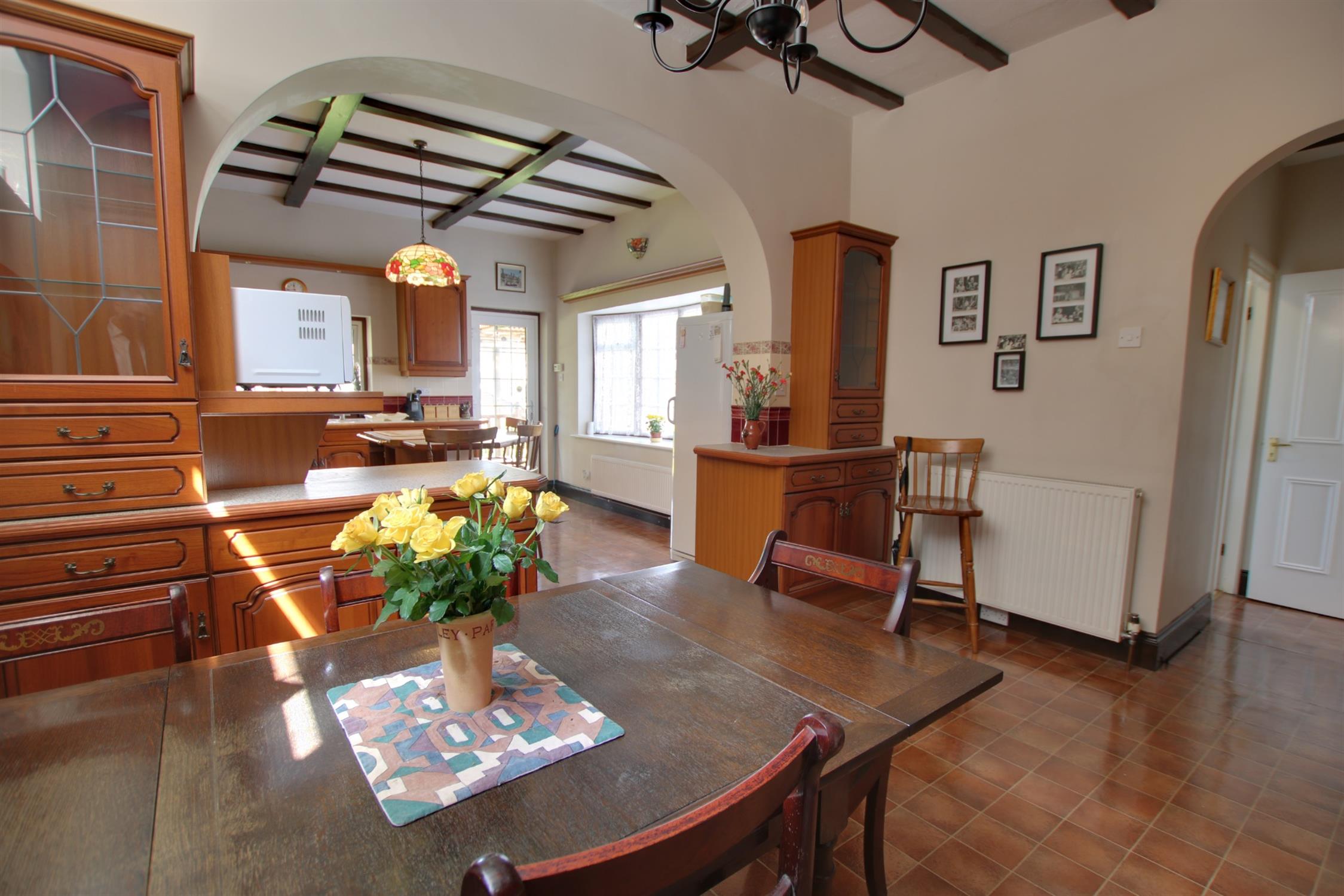 Open plan to kitchen. Double glazed window to side aspect. Feature fireplace with gas fire. Textured ceiling. Built-in cupboards. Door to sitting room, cellar access and opening to the kitchen.