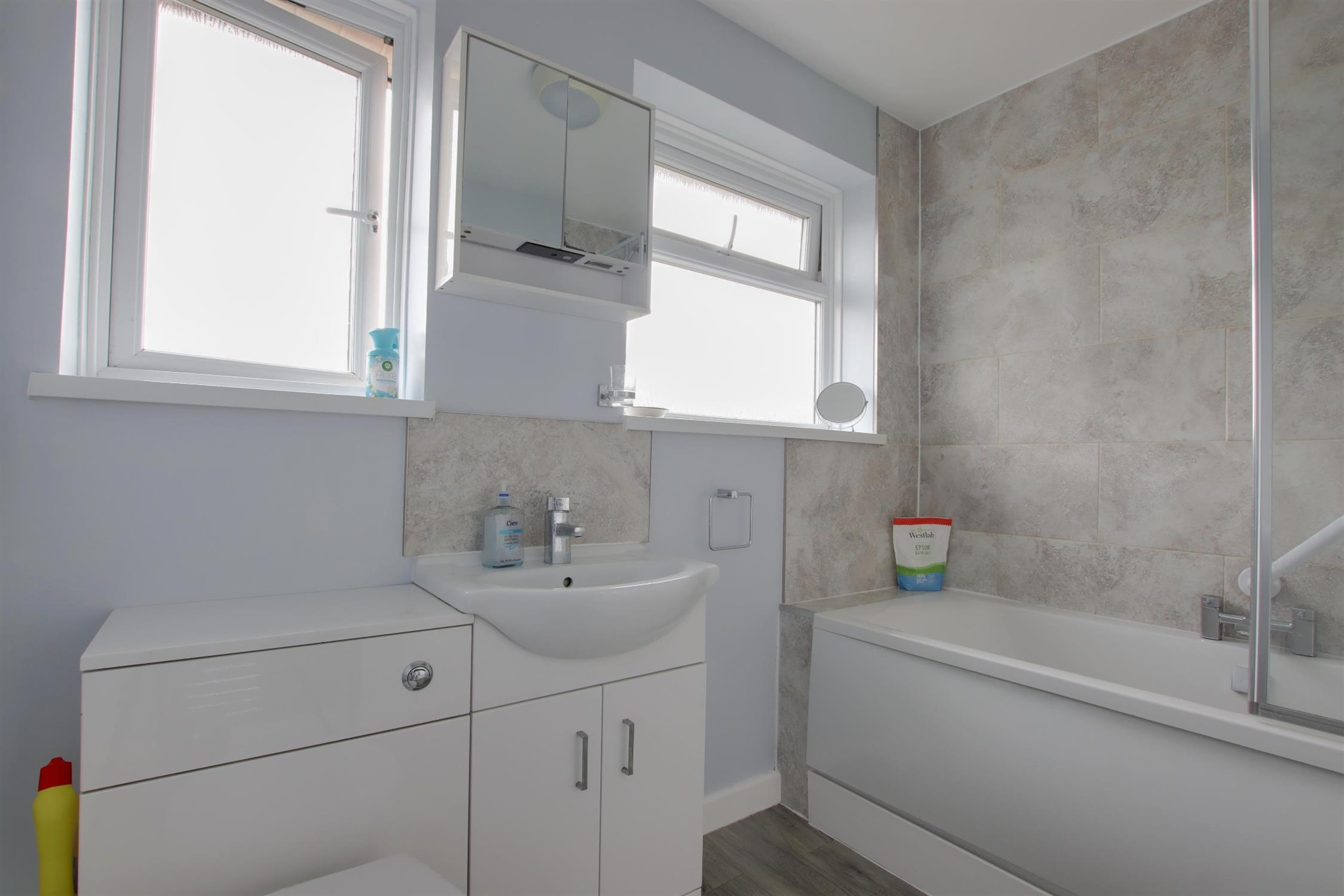 Twin double glazed windows to the rear aspect. Smooth ceiling. Modern suite comprising; bath with shower over and screen. Vanity unit with wash hand basin and low level WC. Heated towel rail. Part tiled walls. Vinyl flooring.