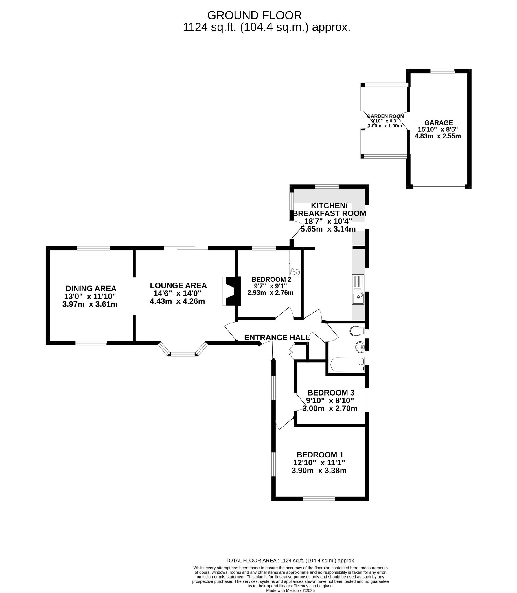 GARAGE: Accessible via up and over door. There is a double glazed garden room attached to the side of the garage, overlooking the attractive rear garden, which has a patio area adjacent to the bungalow.