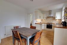 Double glazed window overlooking the rear garden. Smooth ceiling with inset spotlighting. Matching wall and base units with wooden work surfaces. Inset sink and drainer. Part tiled splashback. Four ring gas hob with extractor above. Fitted oven and dishwasher. Space for low level fridge and washing machine. Continuation of the flooring from the dining area.