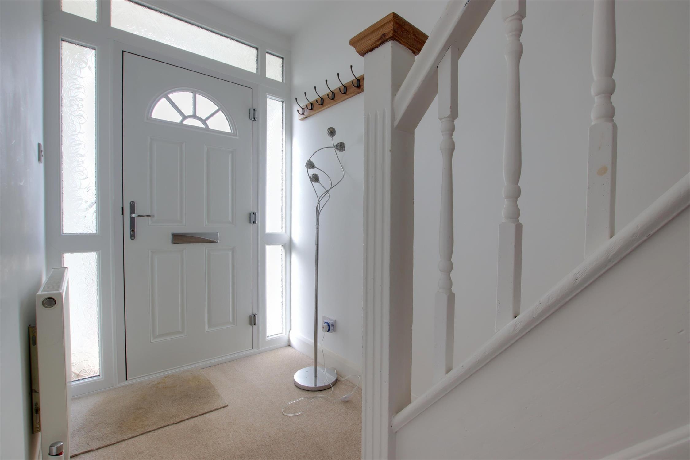 Double glazed front door with double glazed obscure windows either side and above. Smooth ceiling. Staircase rising to the first floor. Meter cupboard. Radiator.