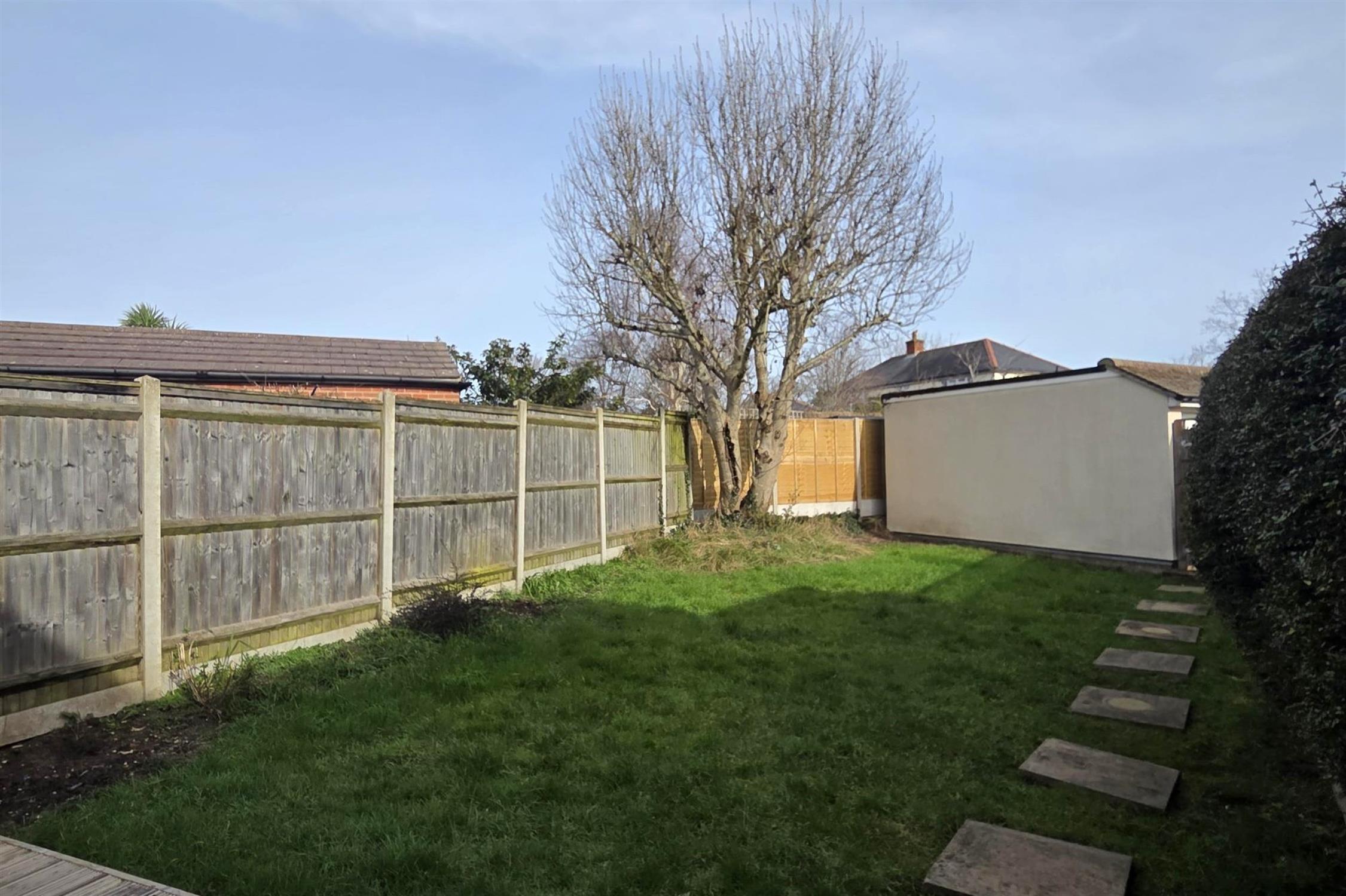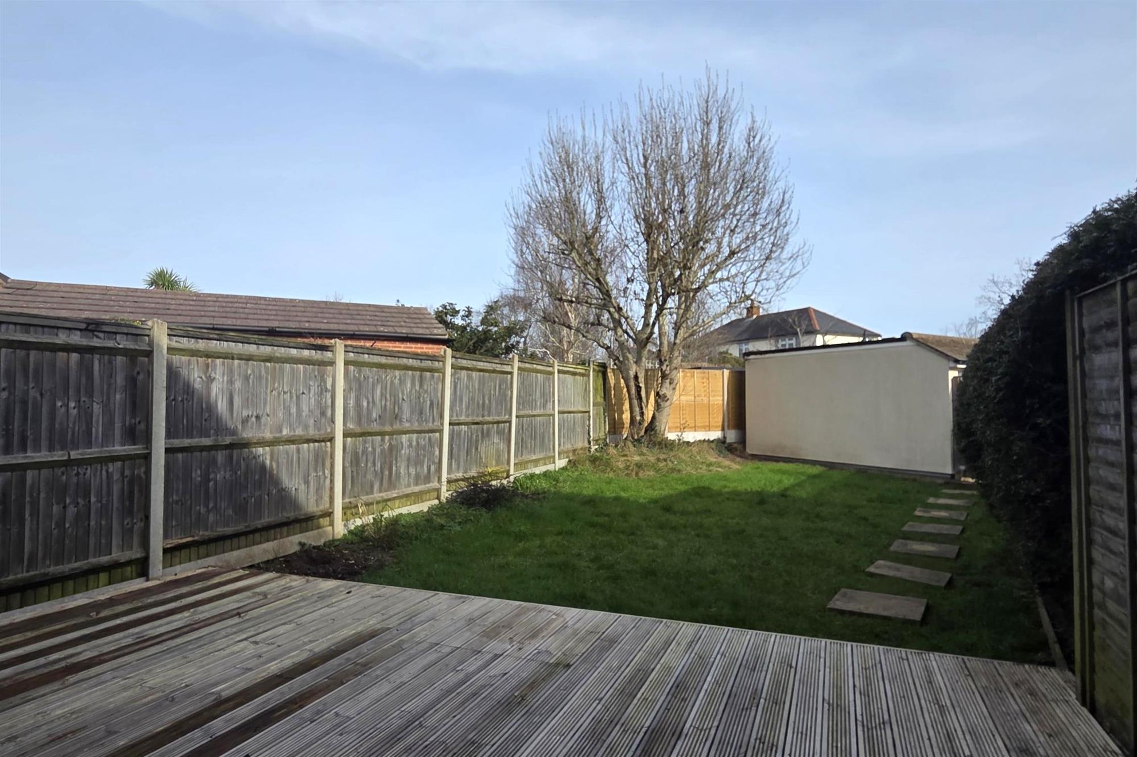 The rear garden has a large initial decked area with an outside tap with the remainder of the garden being laid to lawn.