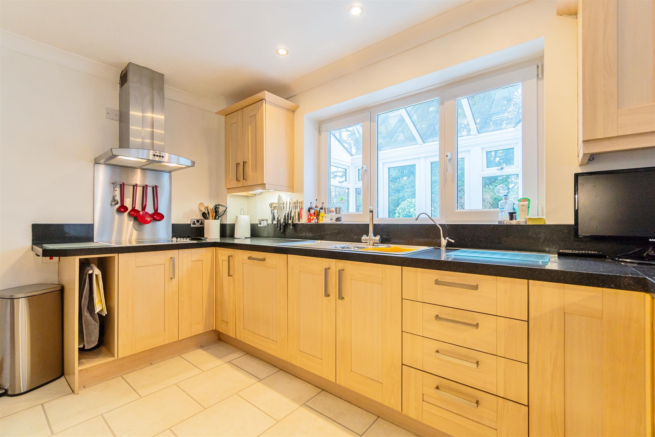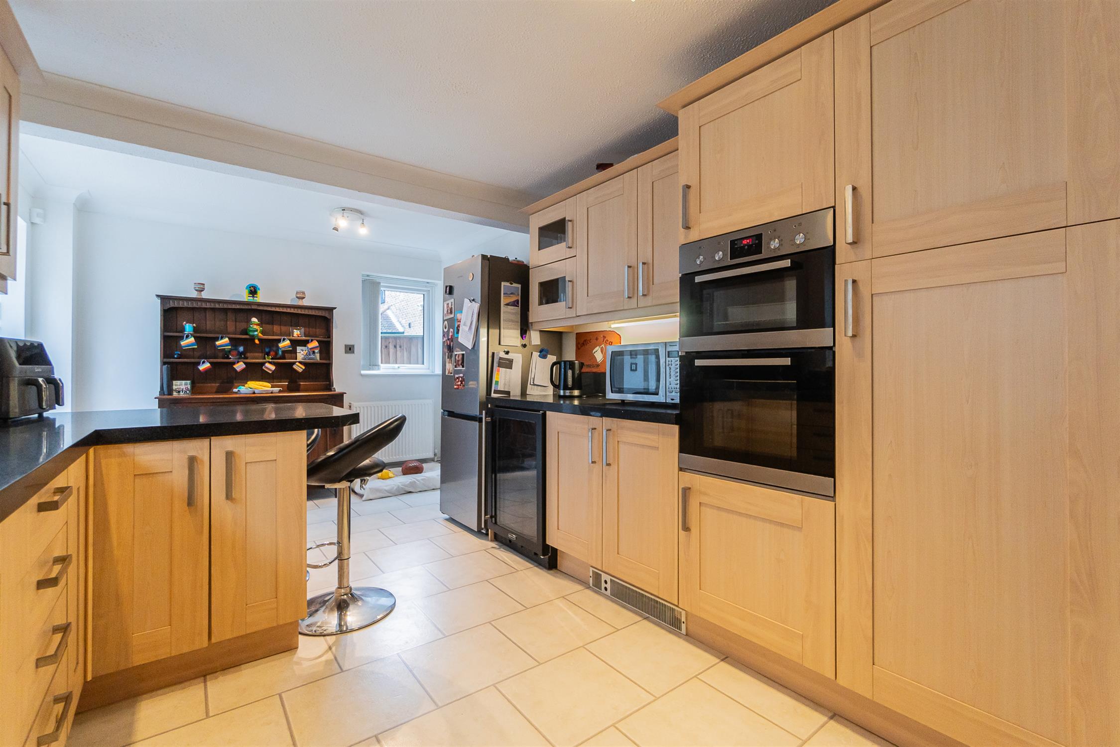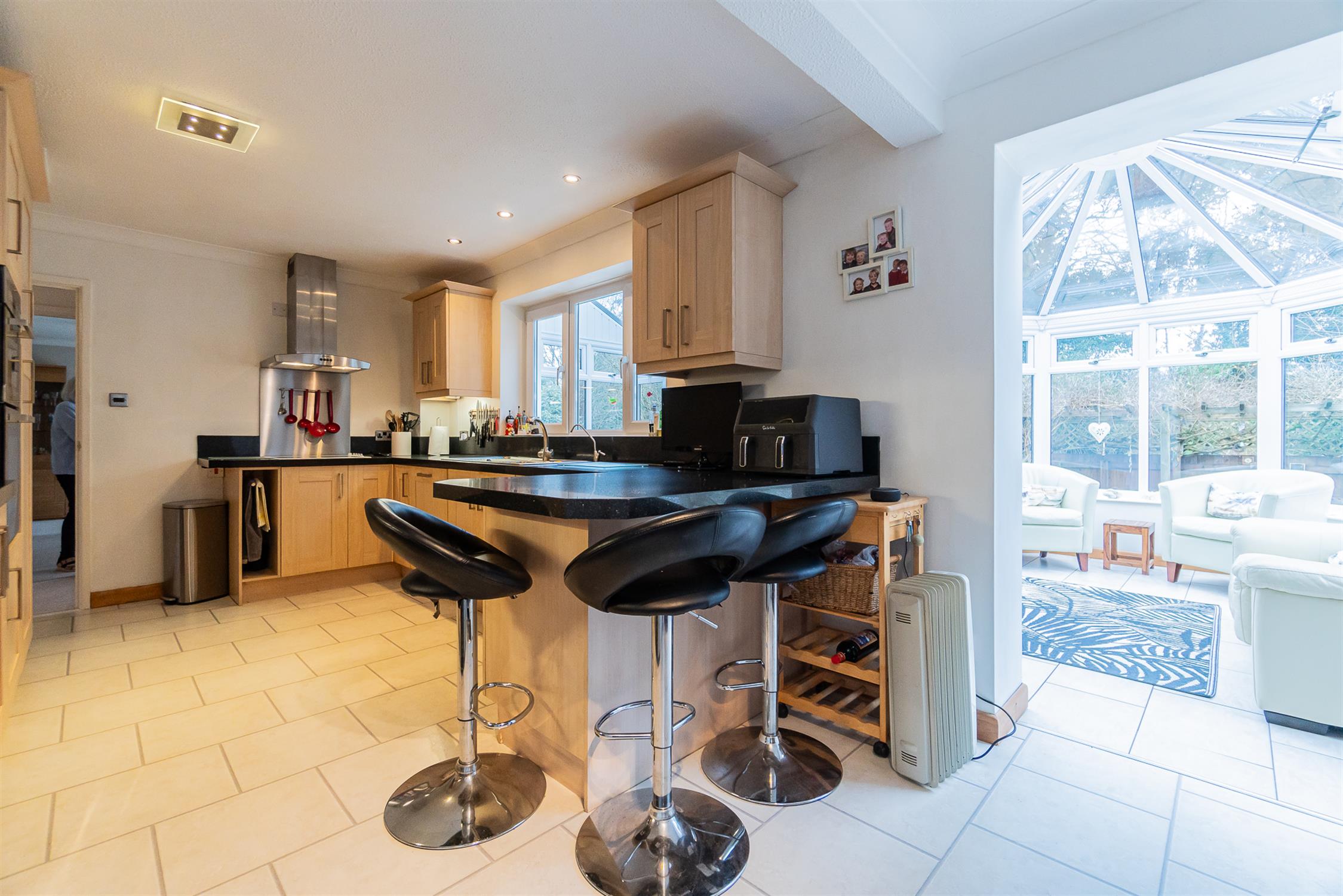 Window to rear and side aspects. Fitted with a comprehensive range of base and wall units with granite working surfaces over. Inset Neff hob with Neff extractor-hood fitted over. Integrated dishwasher. Built-in eye-level double oven. Fitted wine fridge. Space for fridge/freezer. Pennisular breakfast bar. Tile effect laminate flooring. Radiator. Opening to: