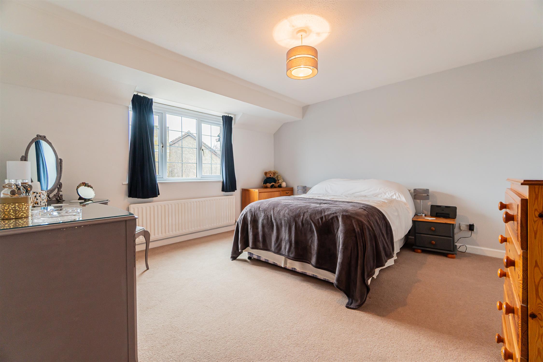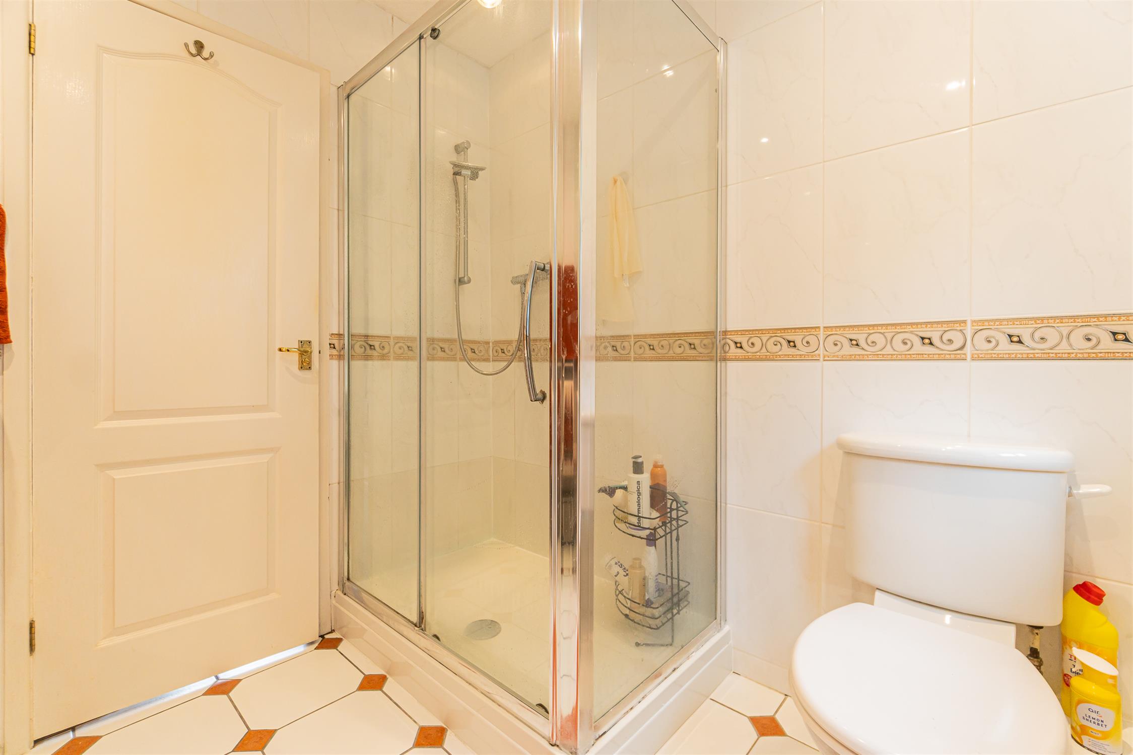 Obscure double-glazed window to rear aspect. Close coupled WC. Large shower cubicle. Vanity unit with inset wash hand basin and built-in cupboards below. Fully tiled walls and flooring. Heated towel radiator.
