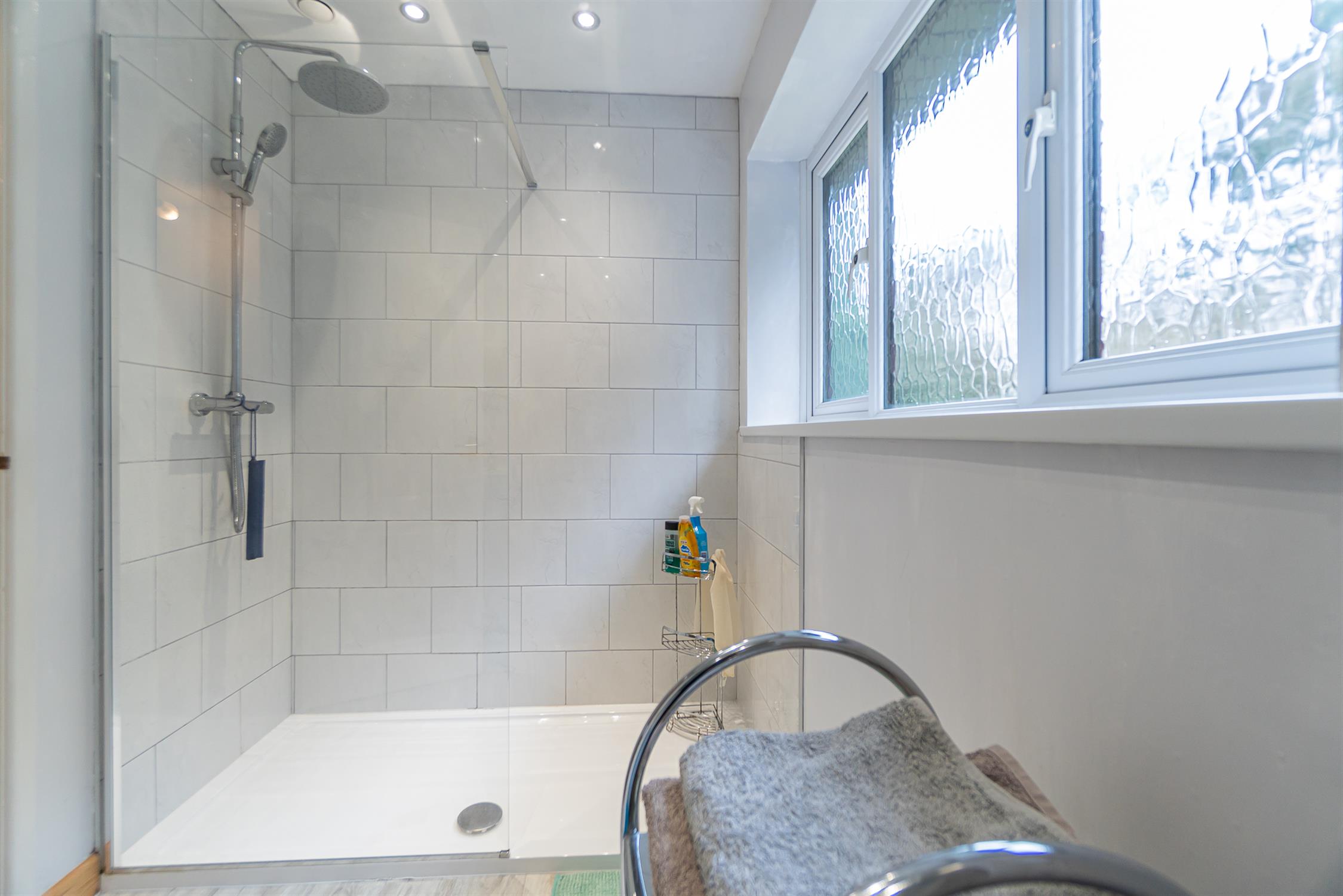 Obscure double-glazed window to rear aspect. Comprising of shower cubicle and drying area. Close coupled WC. Vanity wash hand basin with built-in cupboard below. Chrome heated towel radiator.
