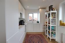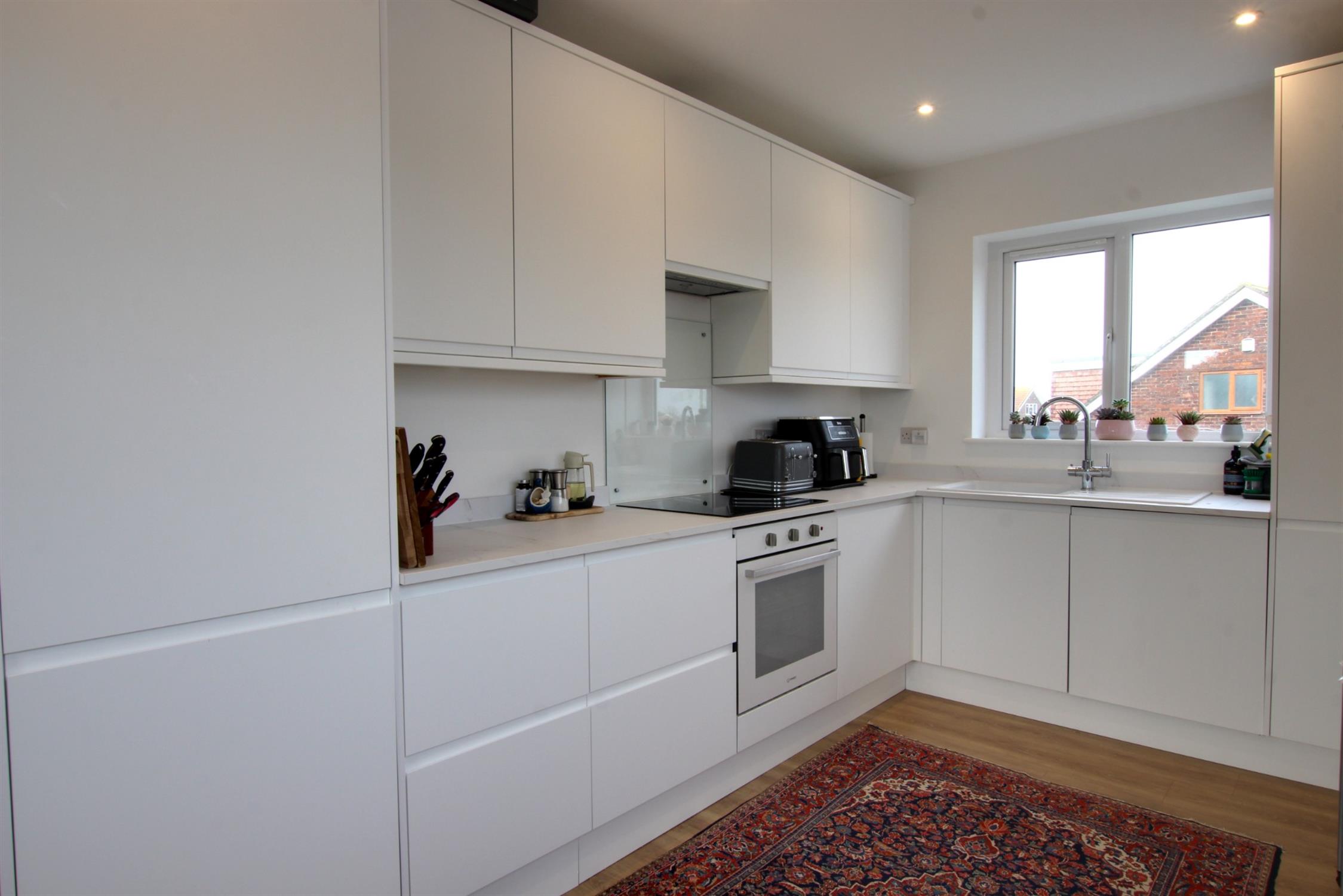 KITCHEN: Modern fitted kitchen offering ample storage and workspace, sink with drainer and an instant hot tap, complete with integrated dishwasher and fridge freezer, fresh white walls, double-glazed UPVC windows with radiator and laminate flooring.