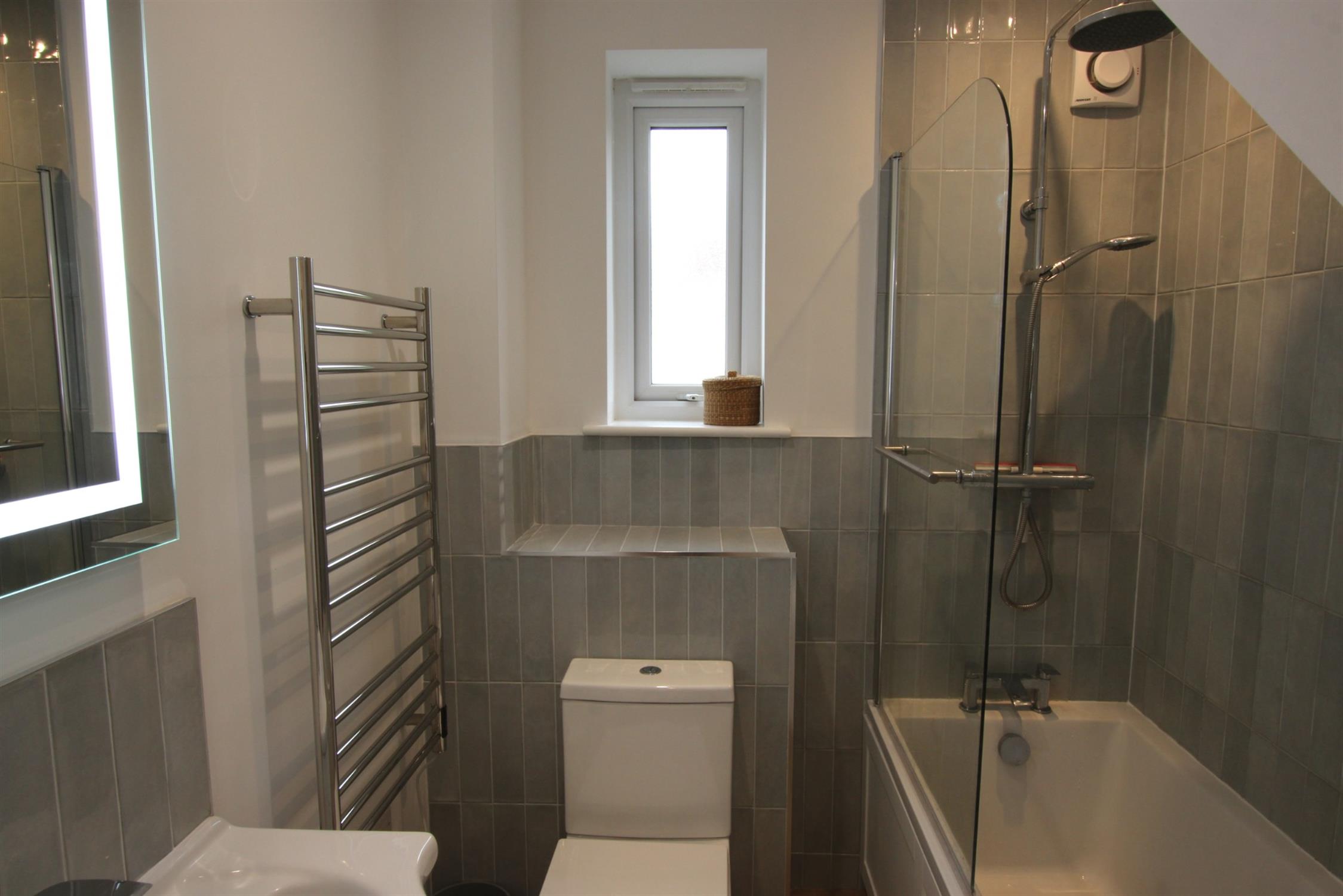 BATHROOM: Stylish family bathroom comprising a bath with over-bath mixer shower, glass shower screen, chrome towel rail for comfortable heating, double-glazed UPVC window and extractor fan for ventilation, wall mounded mirror with built-in light, WC, wash basin and laminate flooring.