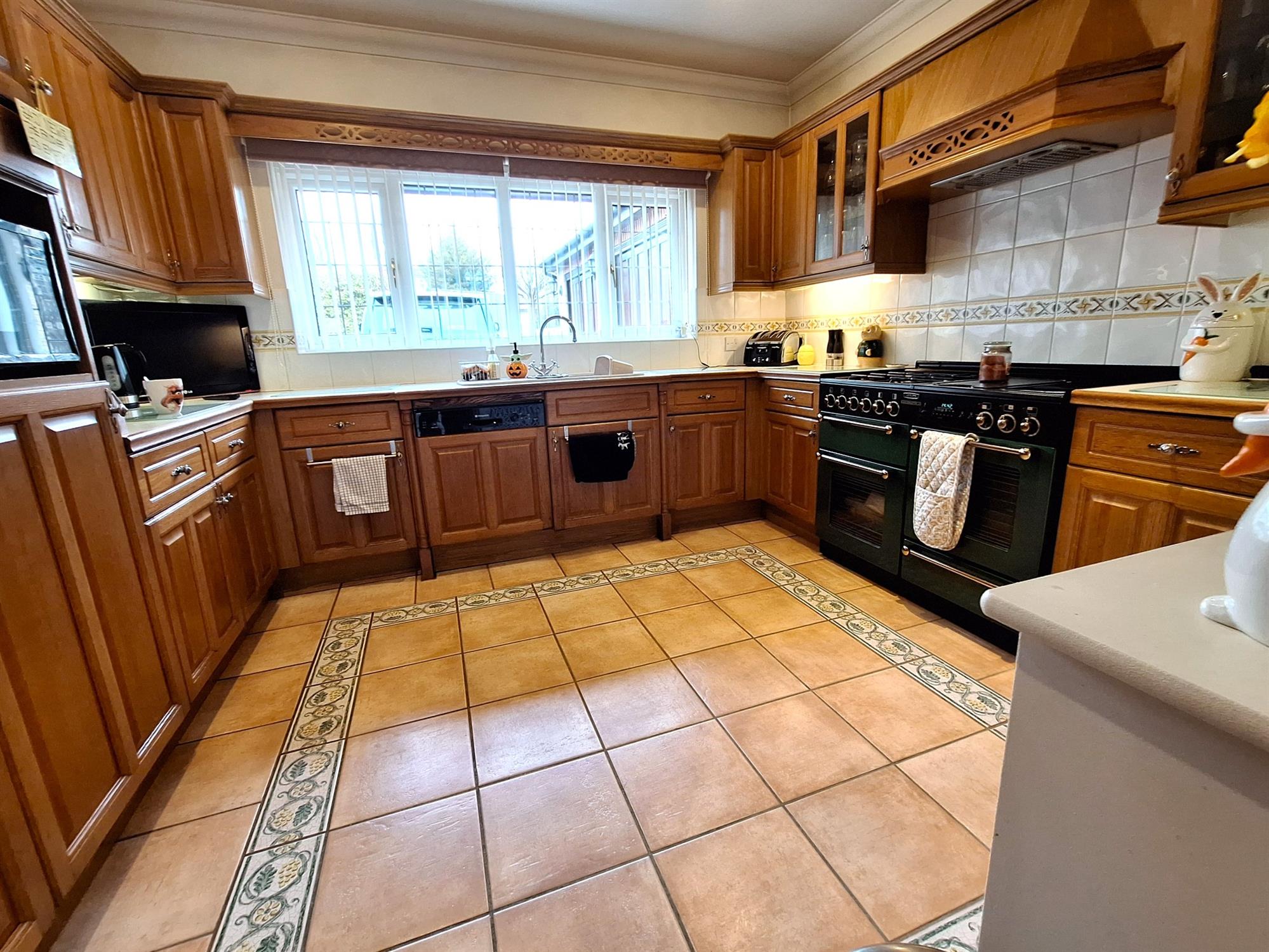 An extensive range of oak wall and floor-fitted cabinetry with work surfacing with tiled splashbacks, space and plumbing for a range-sized cooker, one-and-a-half bowl sink with double glazed window overlooking the front aspect, fitted dishwasher, ceramic tiled flooring, radiator, open aspect to the breakfast dining area, double-glazed french doors and side windows overlooking and accessing the rear garden, radiator, ceramic tiled flooring, door to: