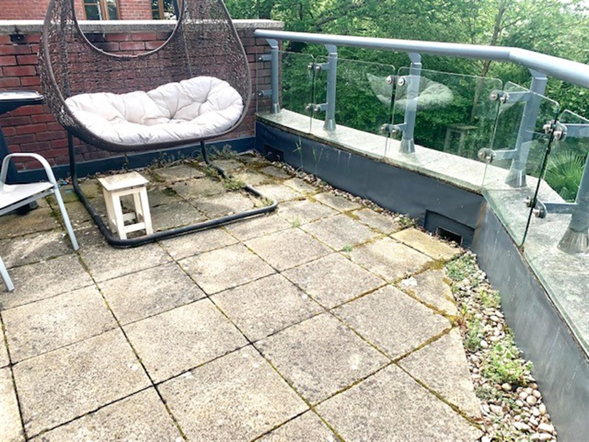 Good size balcony with table and chairs and seated swing.