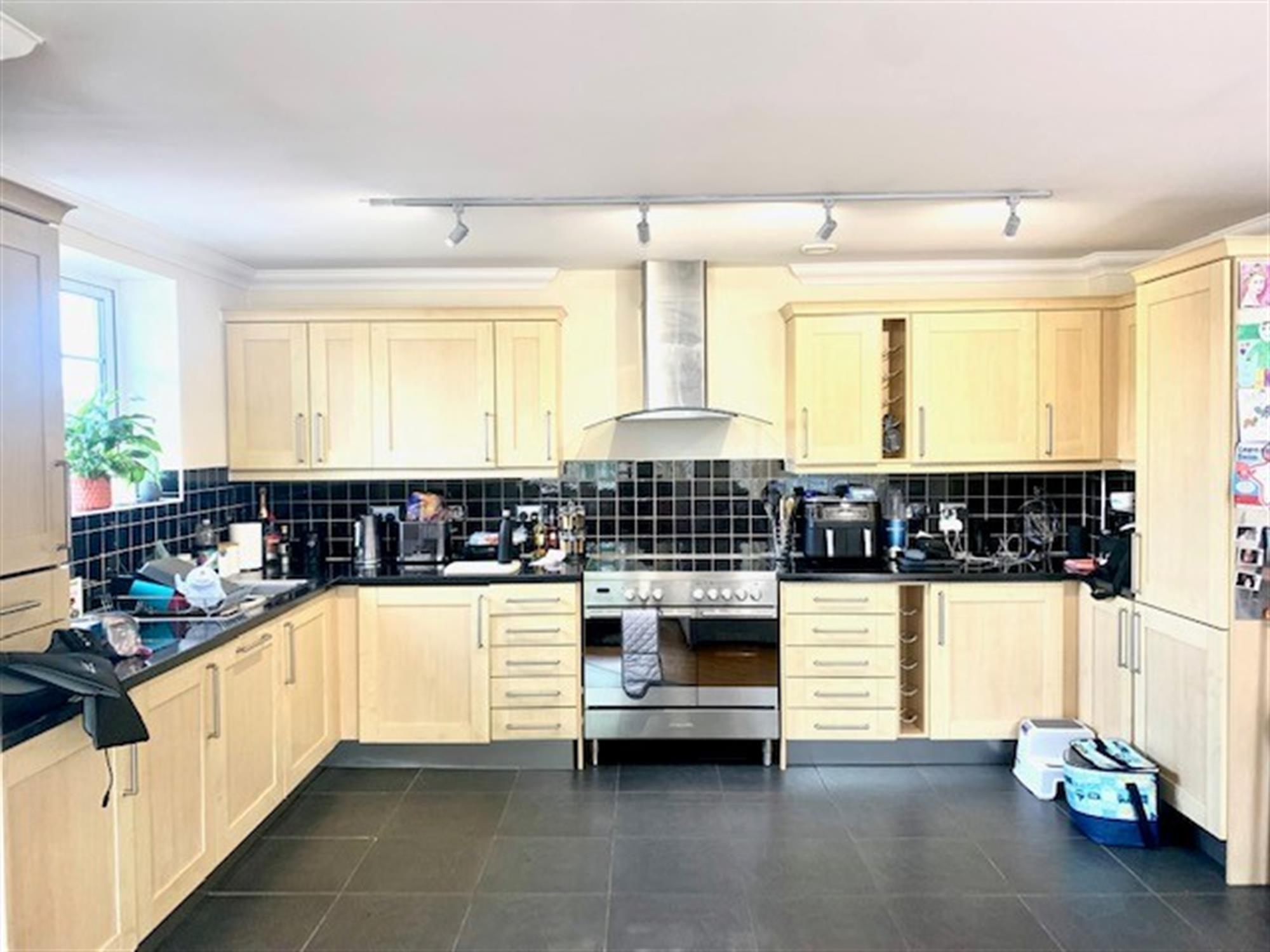 Good size kitchen with various wall and base units. Appliances consisting duel fuel range oven, integral fridge/freezer, integral washing machine and integral dishwasher. Window to side.