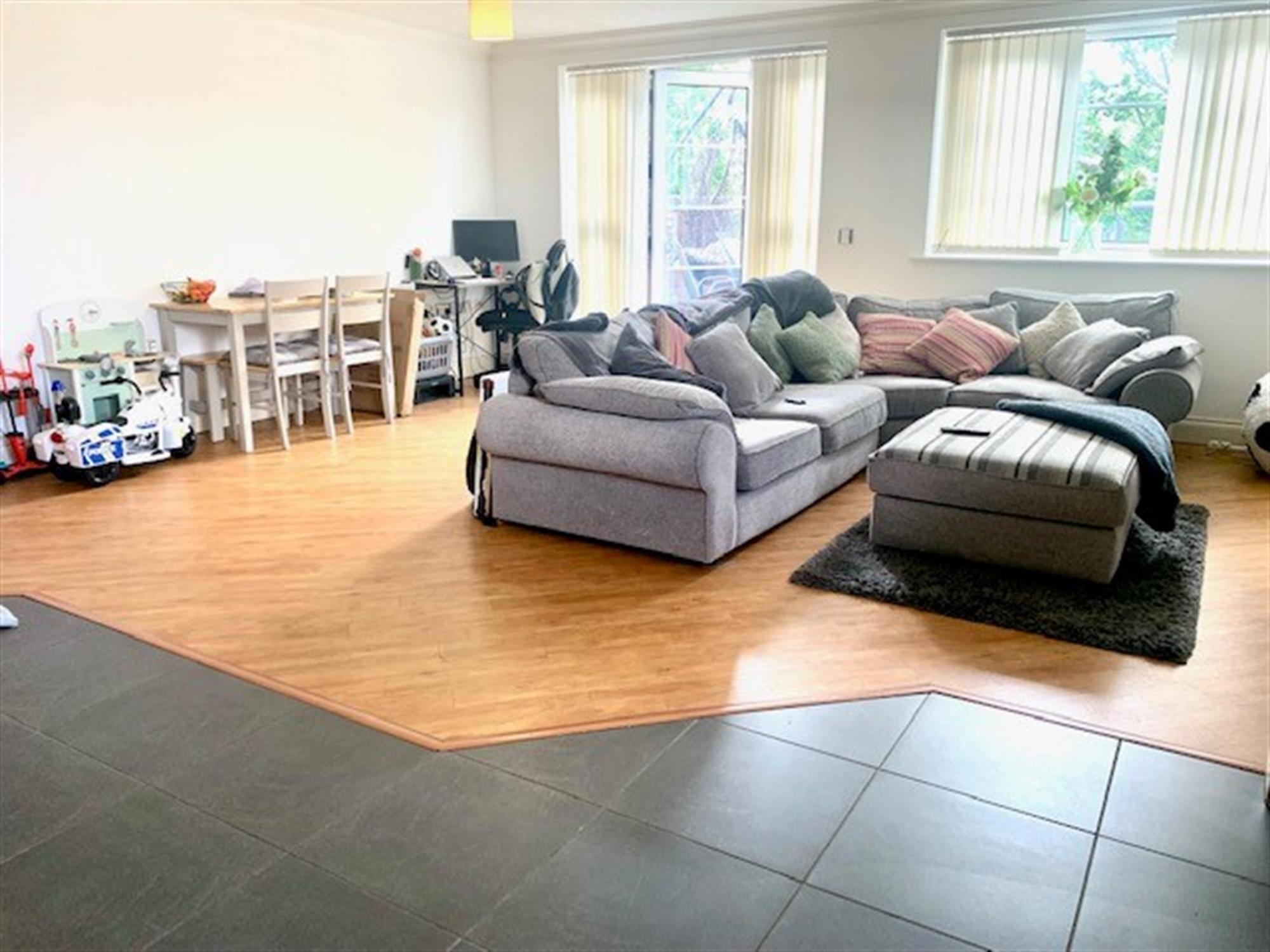 Laminate flooring with French door and window to balcony making the apartment light and airy.