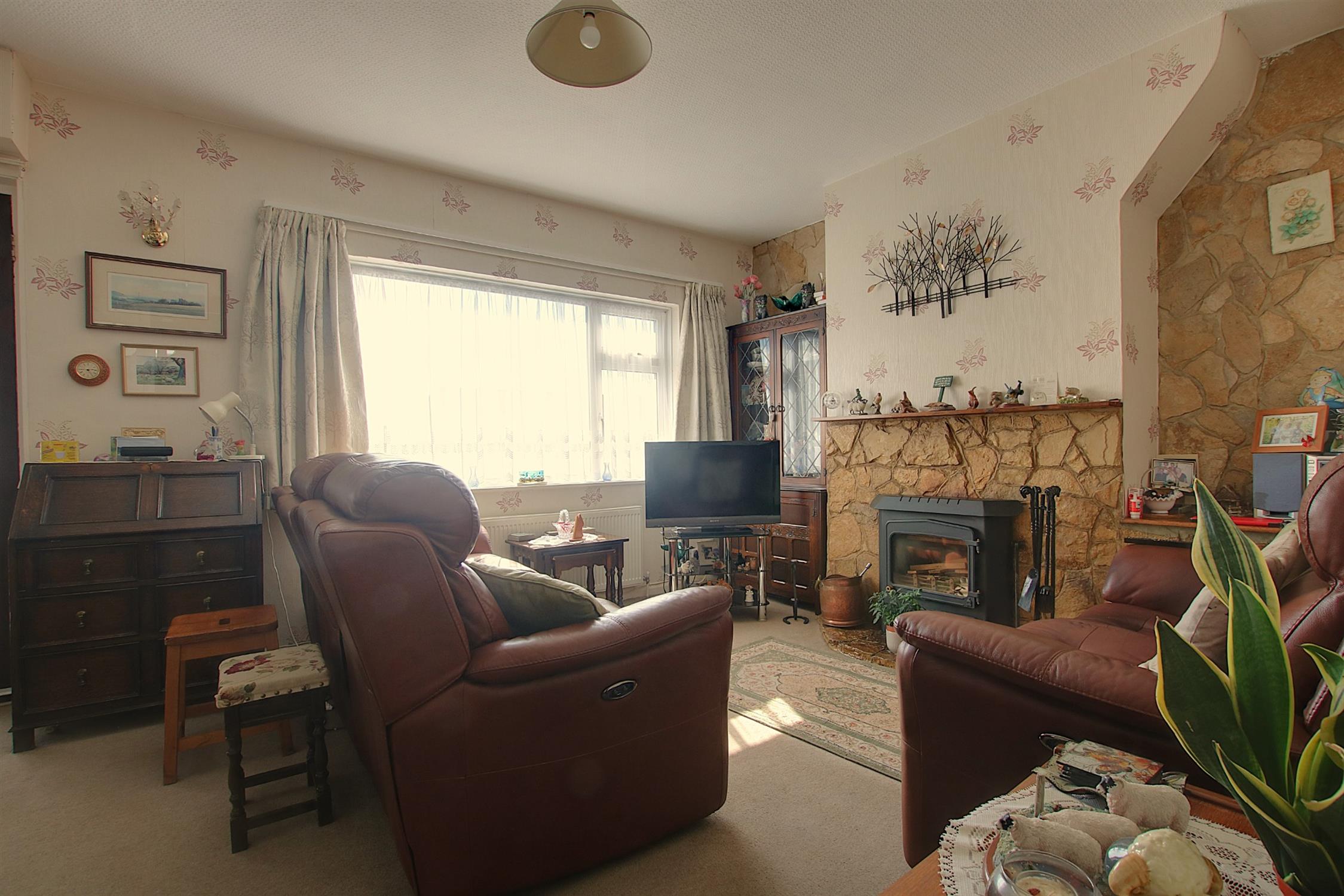 Radiator, windows to the front and side, stairs to the first floor, feature fireplace with inset multi-fuel stove. Sliding door to: