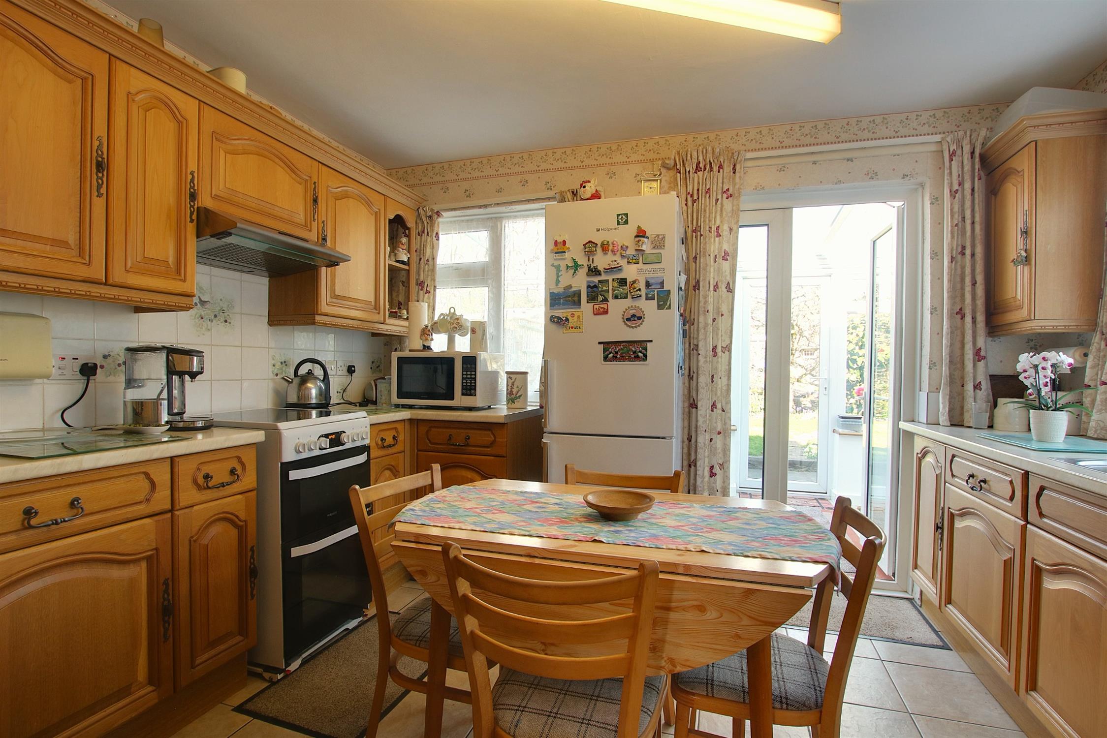 Range of fitted wall and base units with roll-edge work surfaces over and tiled surrounds, inset one-and-a-half bowl sink unit with mixer tap, space for cooker and fridge/freezer, built-in dishwasher, plumbing for washing machine, tiled floor, windows to the side and rear. Double doors to: