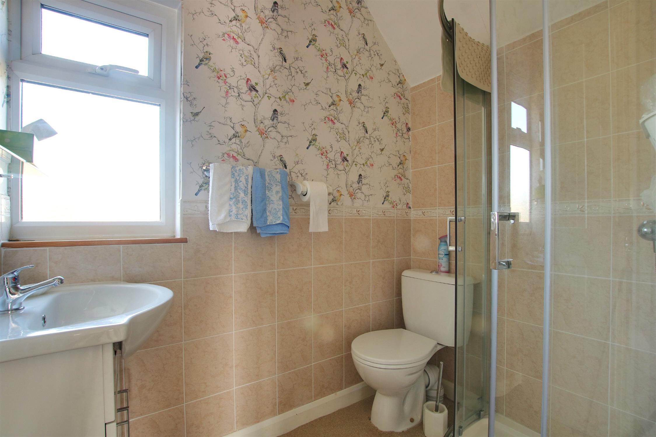 Modern suite comprising tiled shower cubicle, wash basin with cupboard under, WC, radiator, part tiled walls, window to the rear.