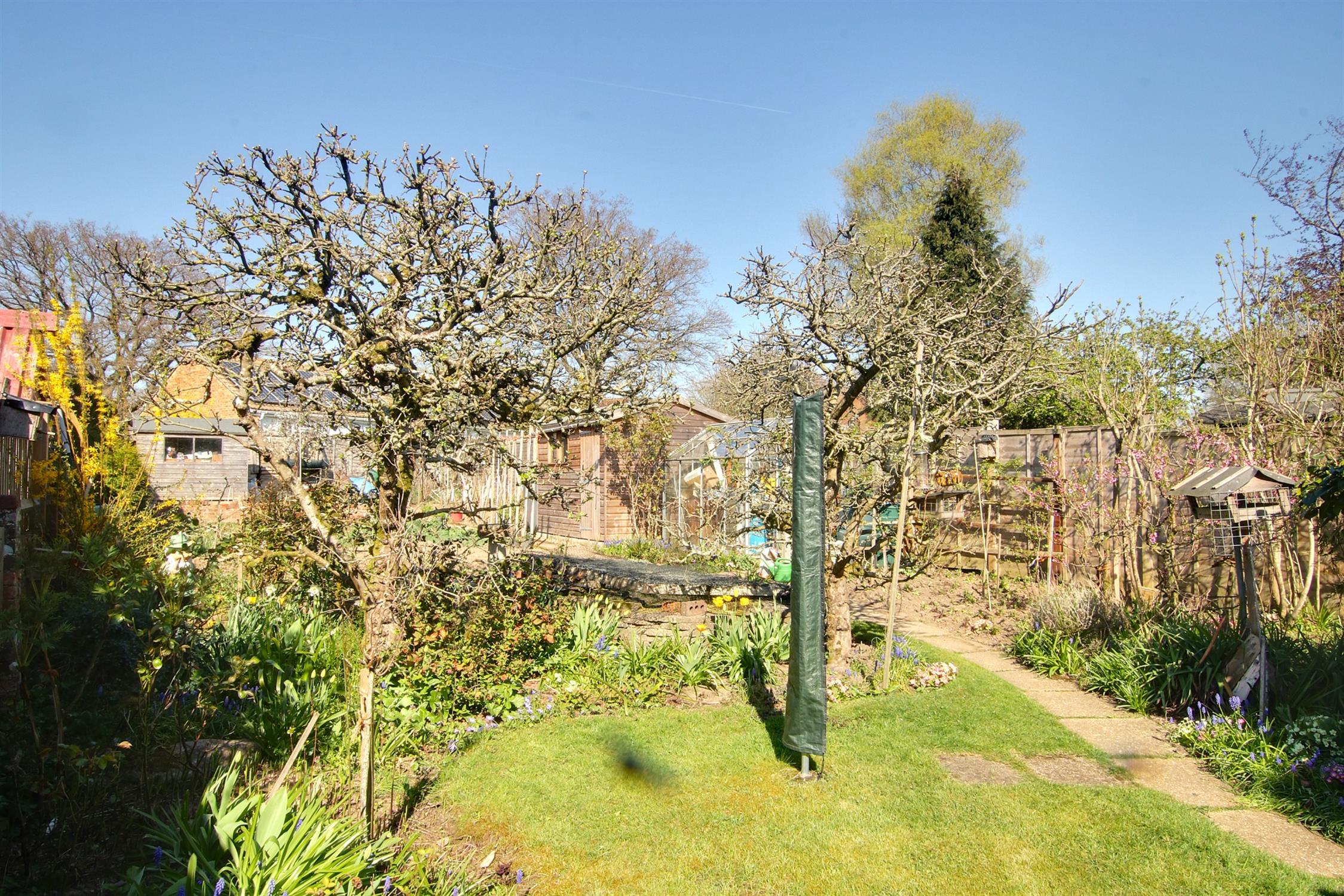 The front garden is mainly laid to lawn with well-stocked flower beds and borders, driveway with off-road parking for two to three cars leading to the detached garage with up-and-over door, power and light. Side access leads to the large rear garden with an area laid to lawn beyond which is a productive vegetable garden, fish pond, garden shed, separate workshop, log store, and a range of fruit trees and soft fruit bushes.