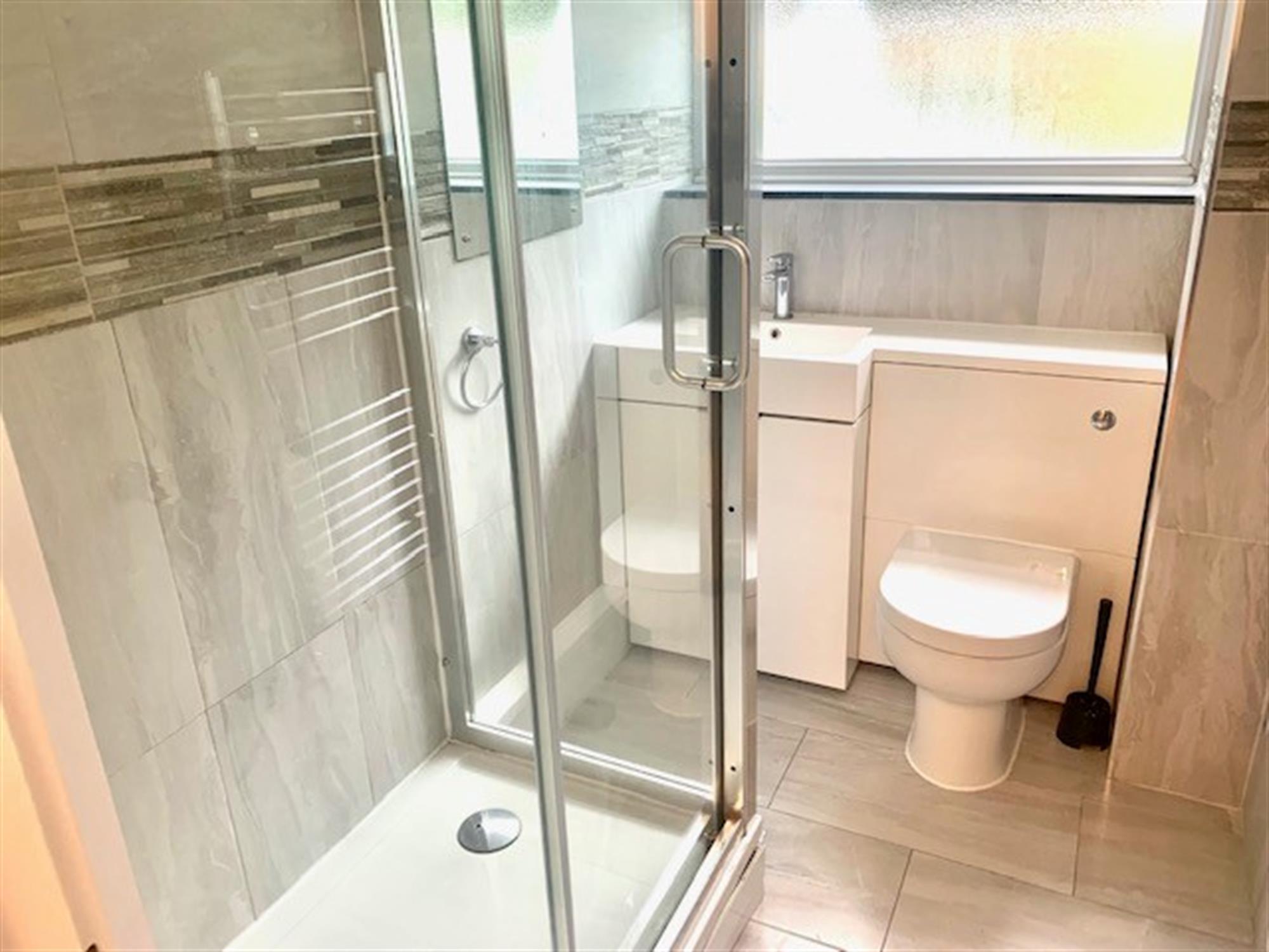 SHOWER ROOM - Double shower cubicle, vanity unit with sink and toilet. Window to rear.
