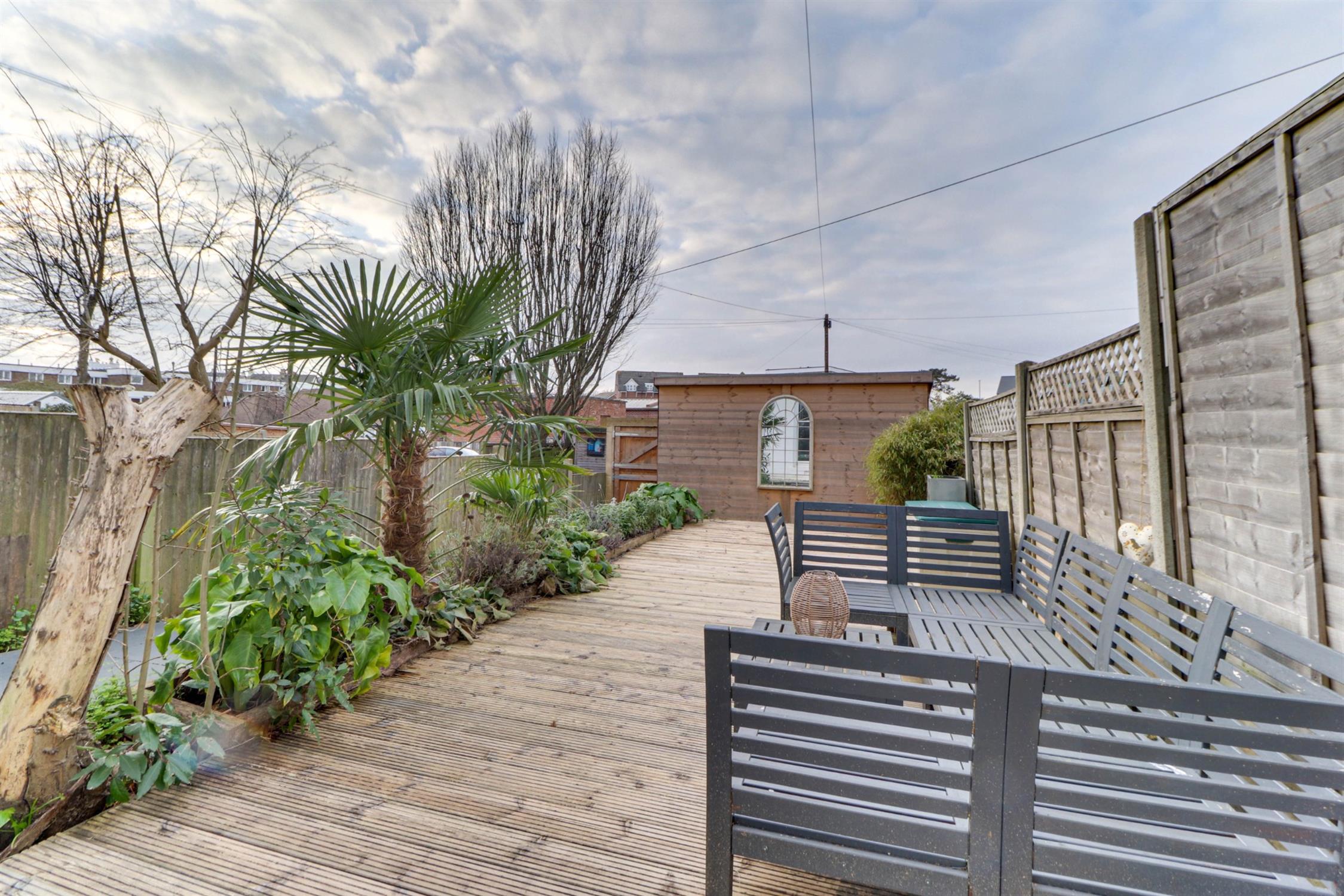 The rear courtyard garden has been landscaped with contemporary decking, artificial lawn, planting beds and sleek white wall boundaries. Rear pedestrian access.