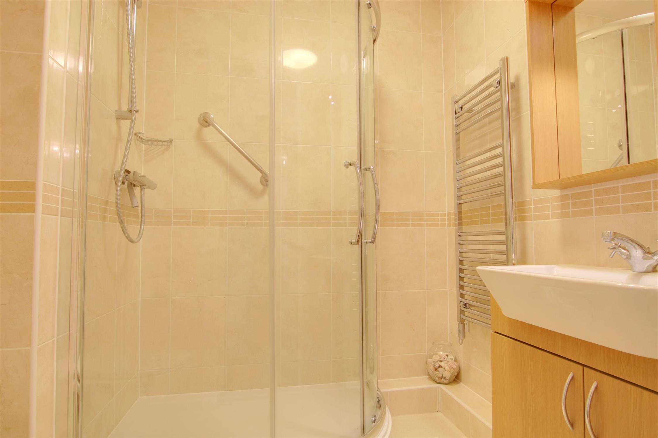 Tiled with broad corner shower cubicle with handrail, wash hand basin with cupboard below and mirror over with lighting, WC with push button cistern, chrome wall mounted heated towel rail, extractor fan.