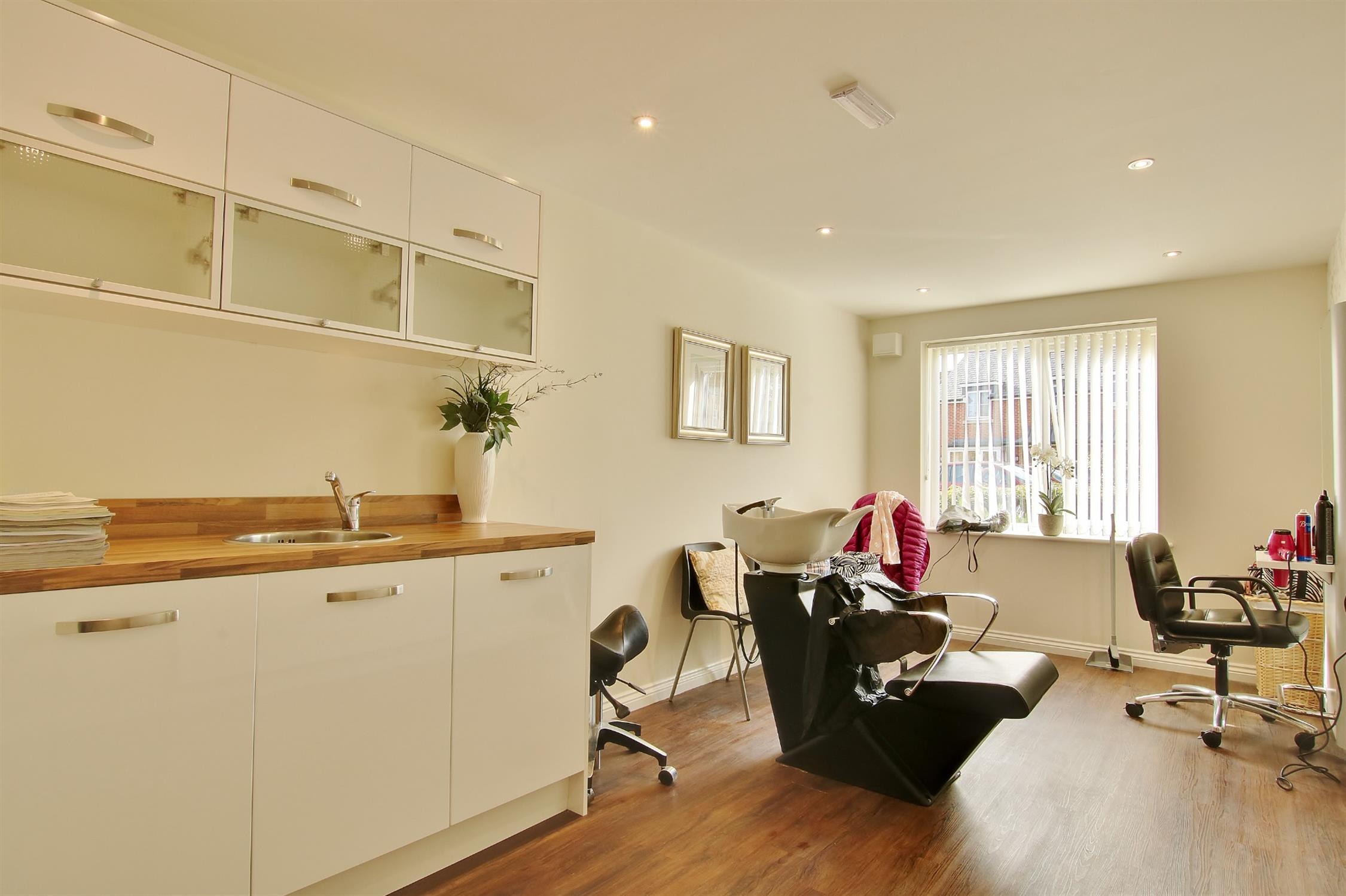 Well proportioned and open to a study/dining area, fireplace with inset electric fire and stone surround, twin double-glazed windows with view towards trees and railway line, deep storage cupboard, glass door to: