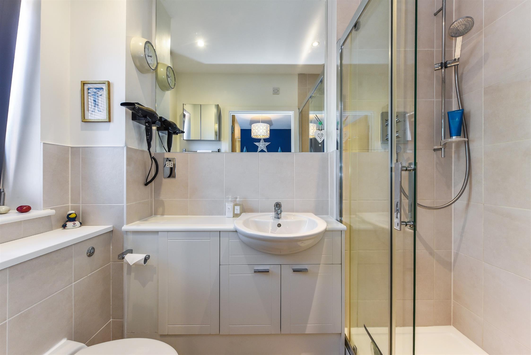 Smooth ceiling with inset spot-lights, extractor fan, shower enclosure, low level WC and wash hand basin set in vanity unit. Ladder radiator, wall mounted electric hair dryer, electric shaver point, fully tiled walls and floor.