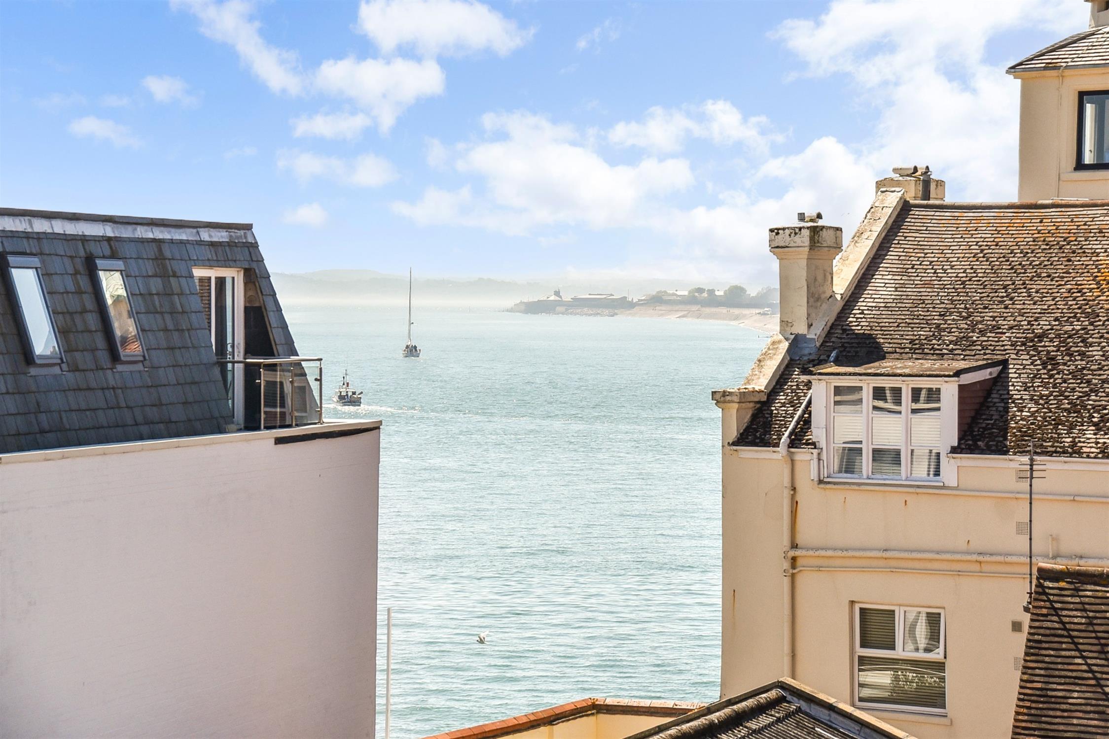 93m) kitchen/breakfast room with diner-style banquette seating with built in Bluetooth speakers, and a further double bedroom with en-suite shower room. The striking top floor is one glorious 27’11 x 15’5 (8.51m x 4.70m) space with ample room for living, dining, entertaining or working and has a high vaulted ceiling adding height and drama. A step up onto a south westerly balcony offers superb views over the Hot Walls into the Harbour mouth, the Solent and down Broad Street. The water rates and window cleaning are included in the rent.