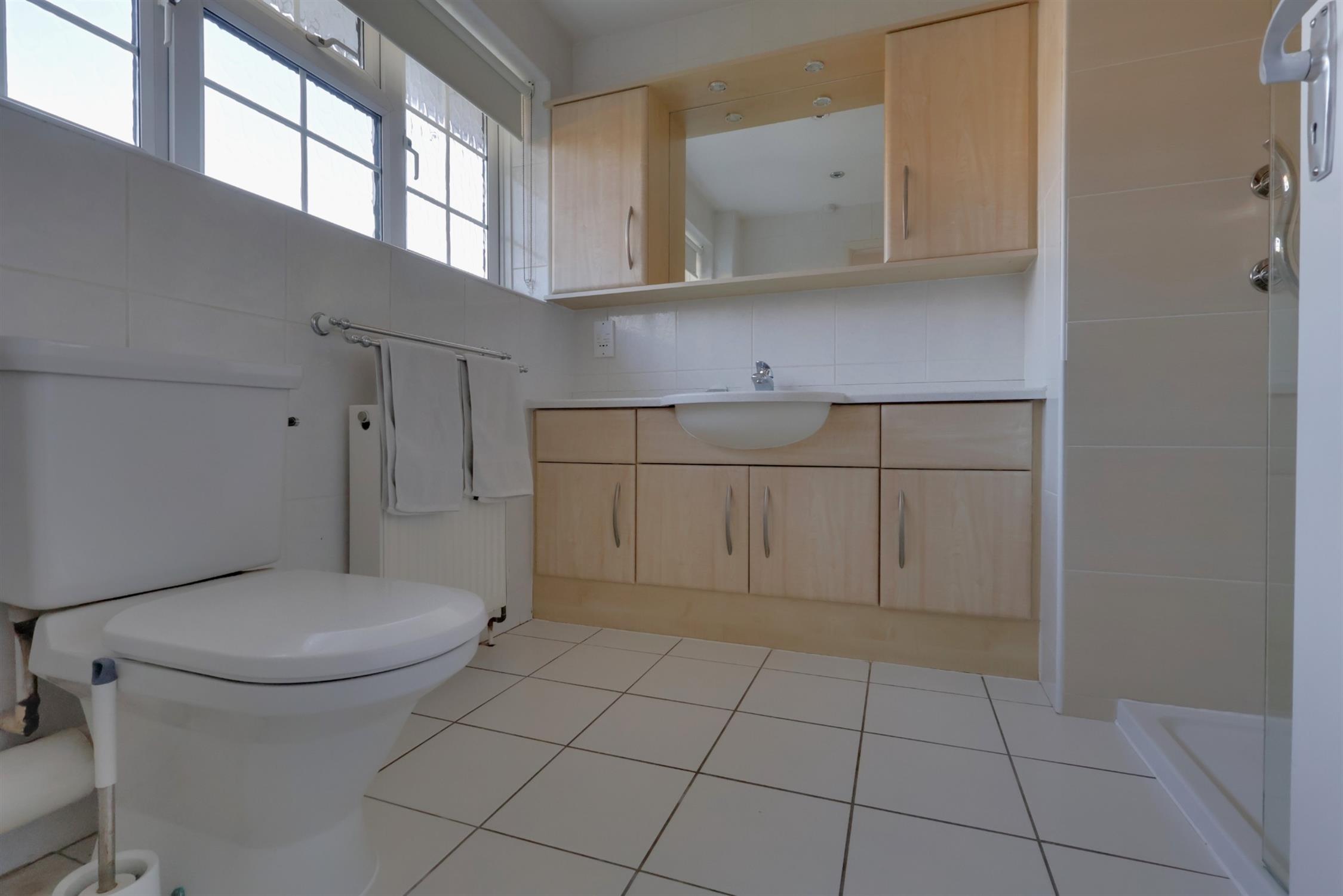 Shower cubicle. WC. Ceramic sink. Radiator. Tiled flooring. Frosted double glazed window.