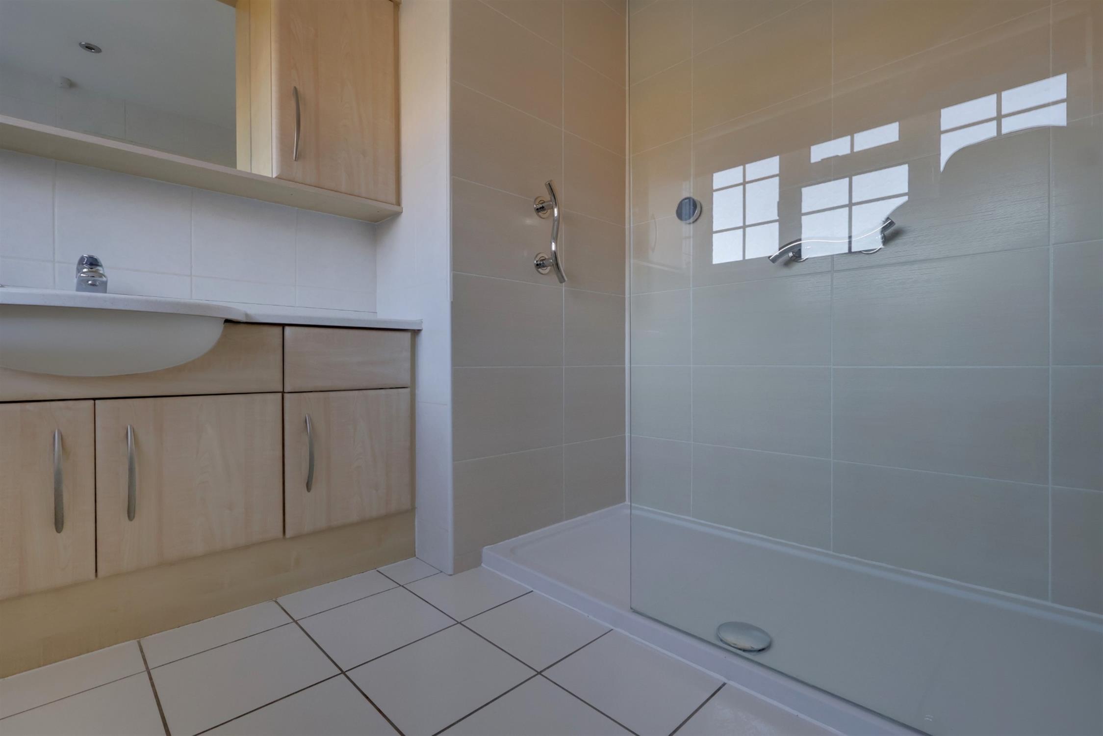 Walk-in shower cubicle. WC. Ceramic sink with cupboard under. Tiled flooring and walls. Radiator. Frosted double glazed window.