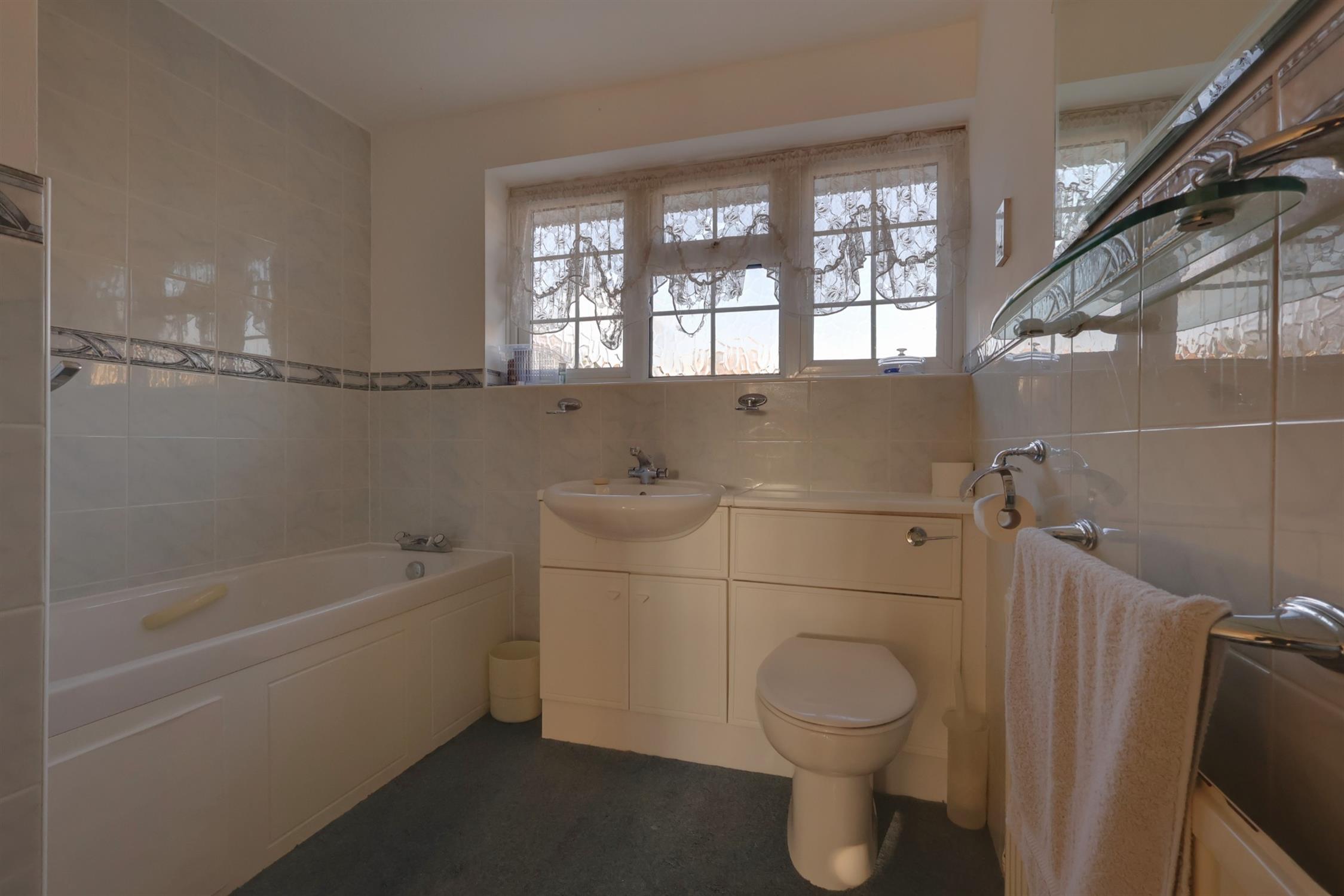Panelled bath with screen and shower attachment. Ceramic sink with cupboard under. WC. Tiled walls. Radiator. Frosted double glazed window.